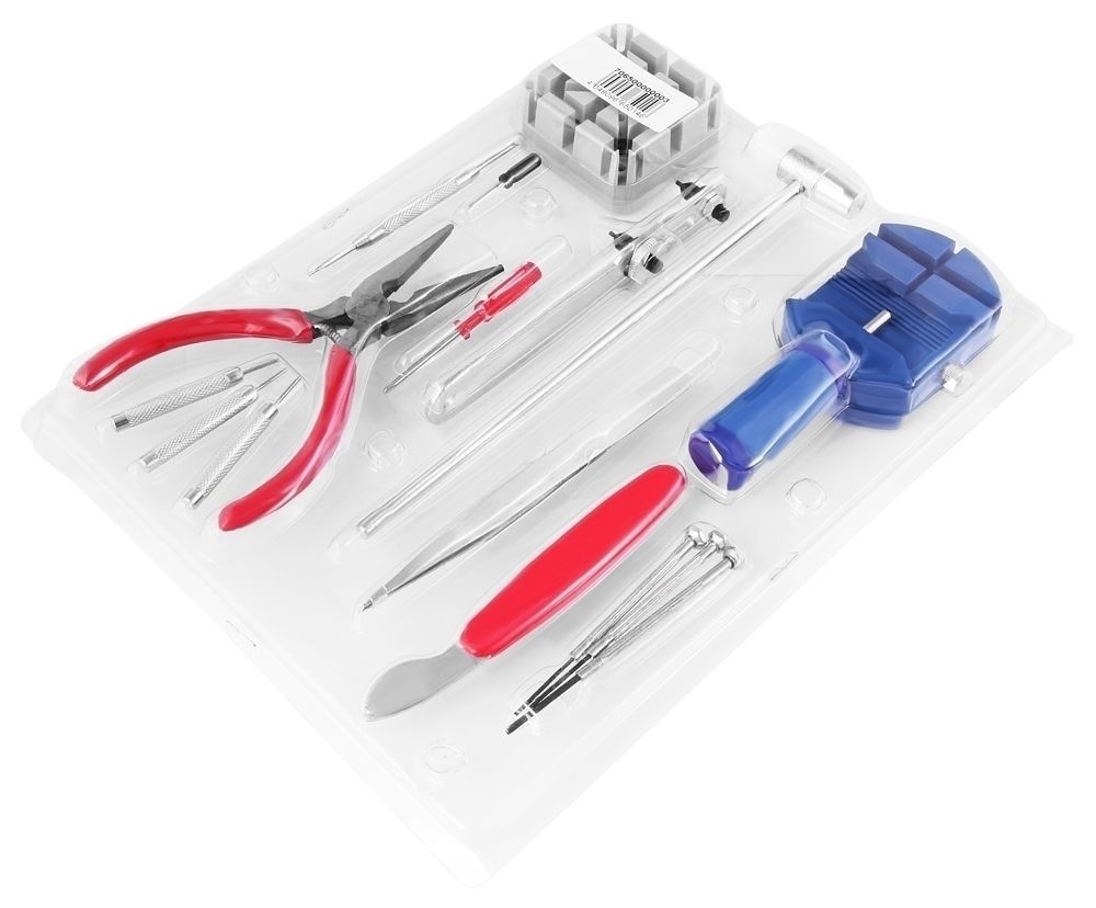 De horlogemakerset bestaat uit 16 onderdelen. Hij bestaat uit drie schroevendraaiers in verschillende maten, een kastopener met een vast blad voor het openen van geperste kastruggen, een penverwijderaar met spindel, een grove centerpons voor het verwisselen van batterijen, een horlogemakershamer, een kastrugopener voor geschroefde kastruggen, een universele tang met handgreep, twee kleine kruiskopschroevendraaiers, drie pennenkloppers, een plastic basis voor het vasthouden van metalen en houten horlogebanden en een veerstanggereedschap. Deze horlogemakerset is ideaal voor gebruik bij het onderhoud van horloges voor het vervangen van batterijen en het vervangen en inkorten van horlogebandjes.