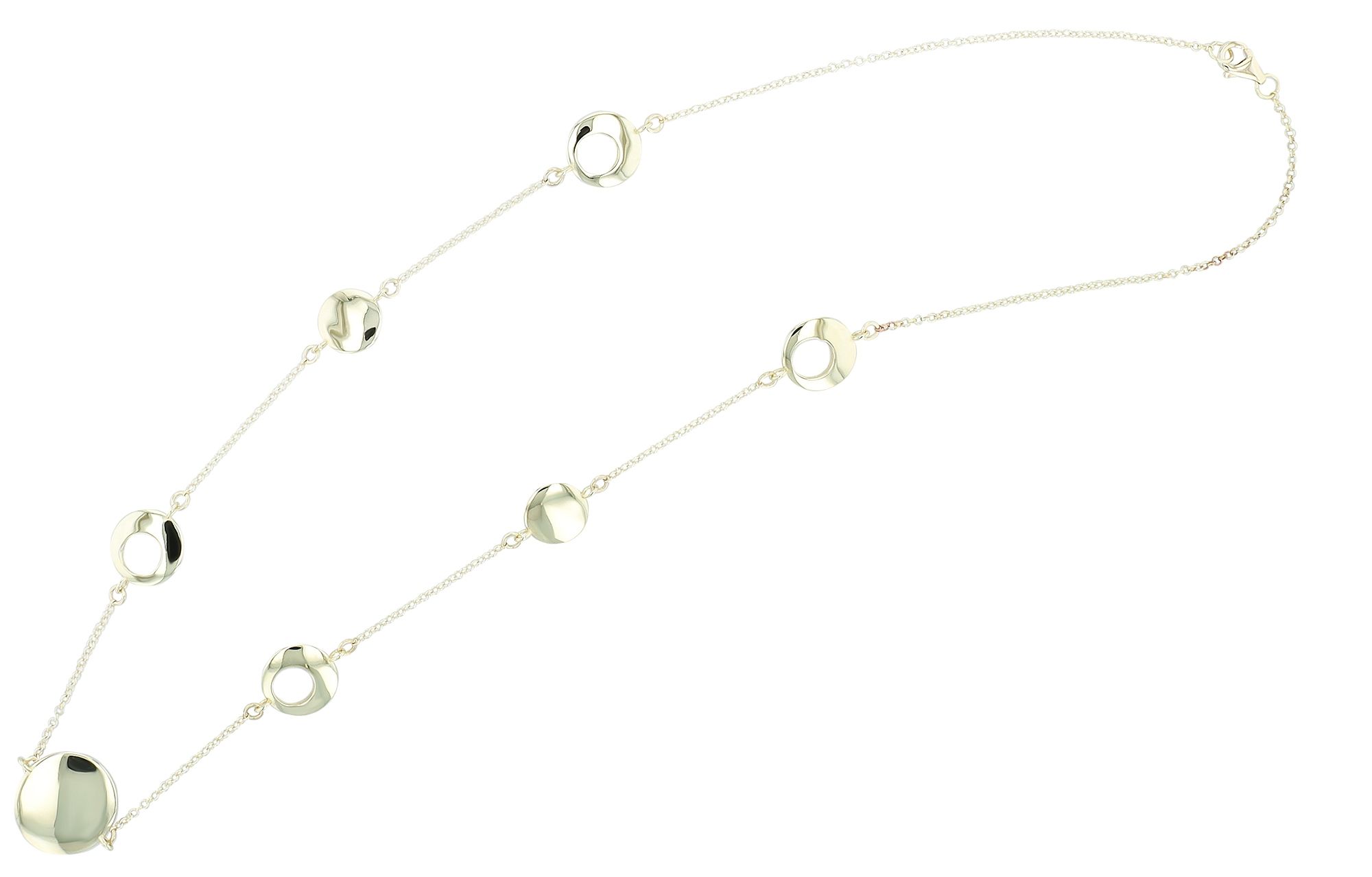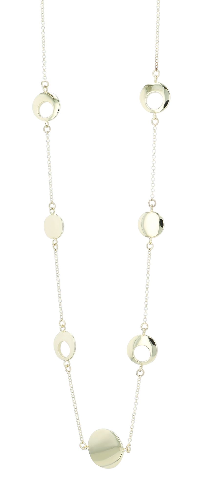 De ketting is gemaakt van 333 goud. De ketting is versierd met ronde elementen en heeft een individuele uitstraling. De elementen zijn aan één kant gepolijst, terwijl de andere kant vakkundig is versierd met geponste gaatjes. De ketting kan gedragen worden afhankelijk van je stemming. Met een lengte van 45 cm en een dikte van 1 mm omhelst de ketting perfect het decolleté en is hij comfortabel om te dragen. De ketting kan eenvoudig worden vastgemaakt met een karabijnsluiting. Het tijdloze ontwerp maakt het mogelijk om het te combineren met andere sieraden en verschillende outfits, waardoor het de ideale metgezel is voor elke gelegenheid.