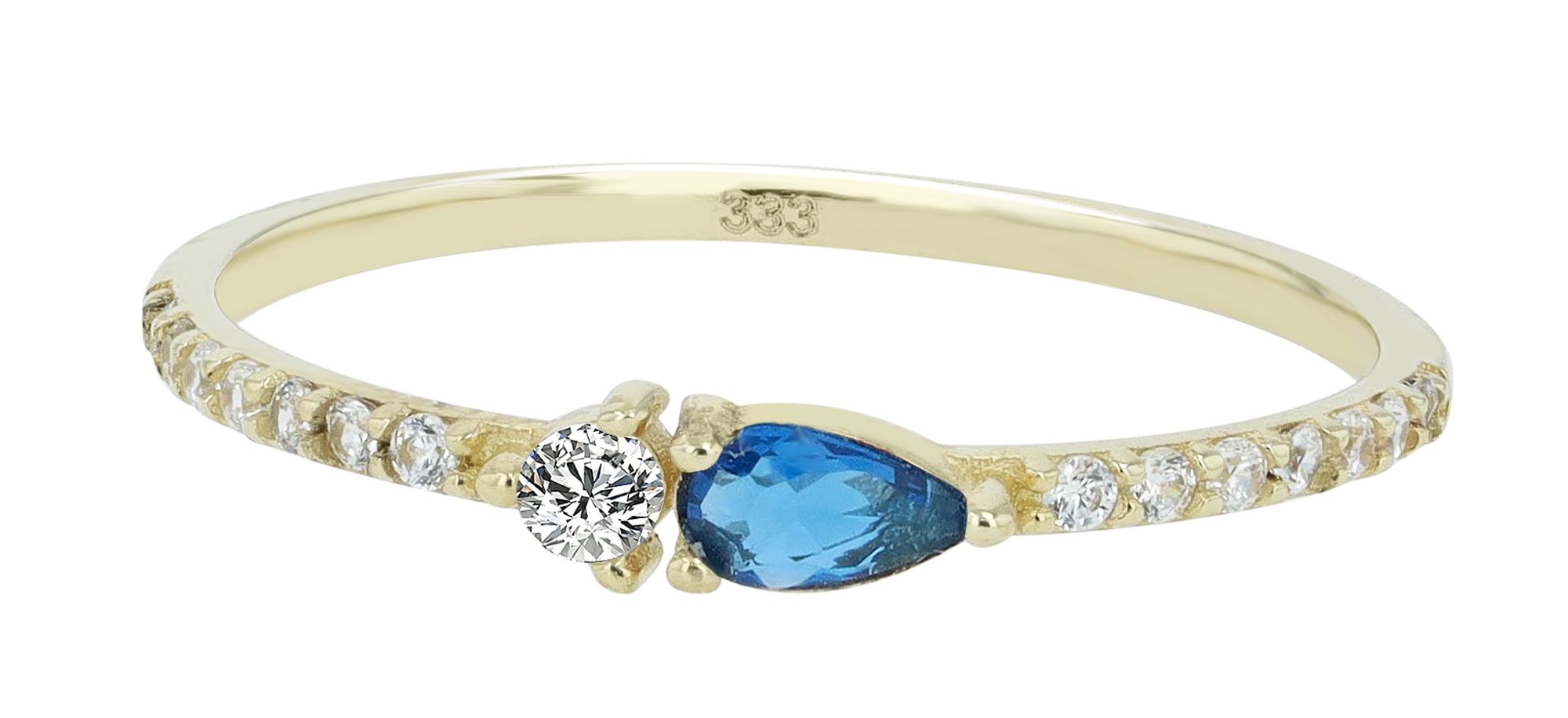 Deze elegante, delicate damesring is gemaakt van 333 goud. Hij is gezet met een blauwe druppelvormige zirkonia en een ronde witte zirkonia van 2 mm. Er zijn 7 kleine witte zirkonia steentjes rechts en links. De zetting geeft het vingersieraad een bijzondere schittering. Met een breedte van 3 mm en een hoogte van 2 mm past de ring perfect om de vinger. Het sieraad is verkrijgbaar in de maten 52 tot 60 en het tijdloze en discrete ontwerp maakt de ring tot een veelzijdig accessoire voor elke dag en elke gelegenheid. Het sieraad is ook ideaal als cadeau.