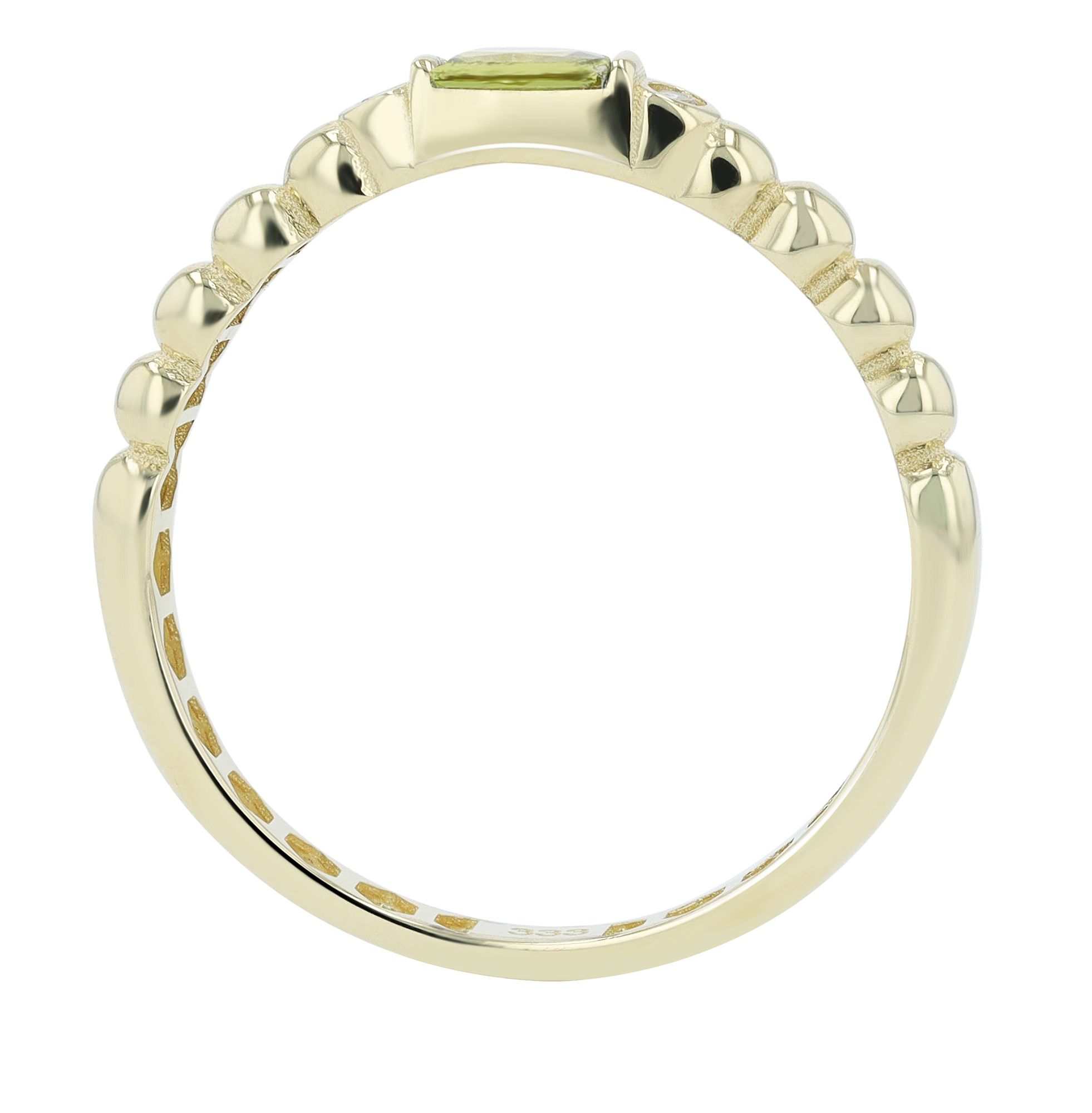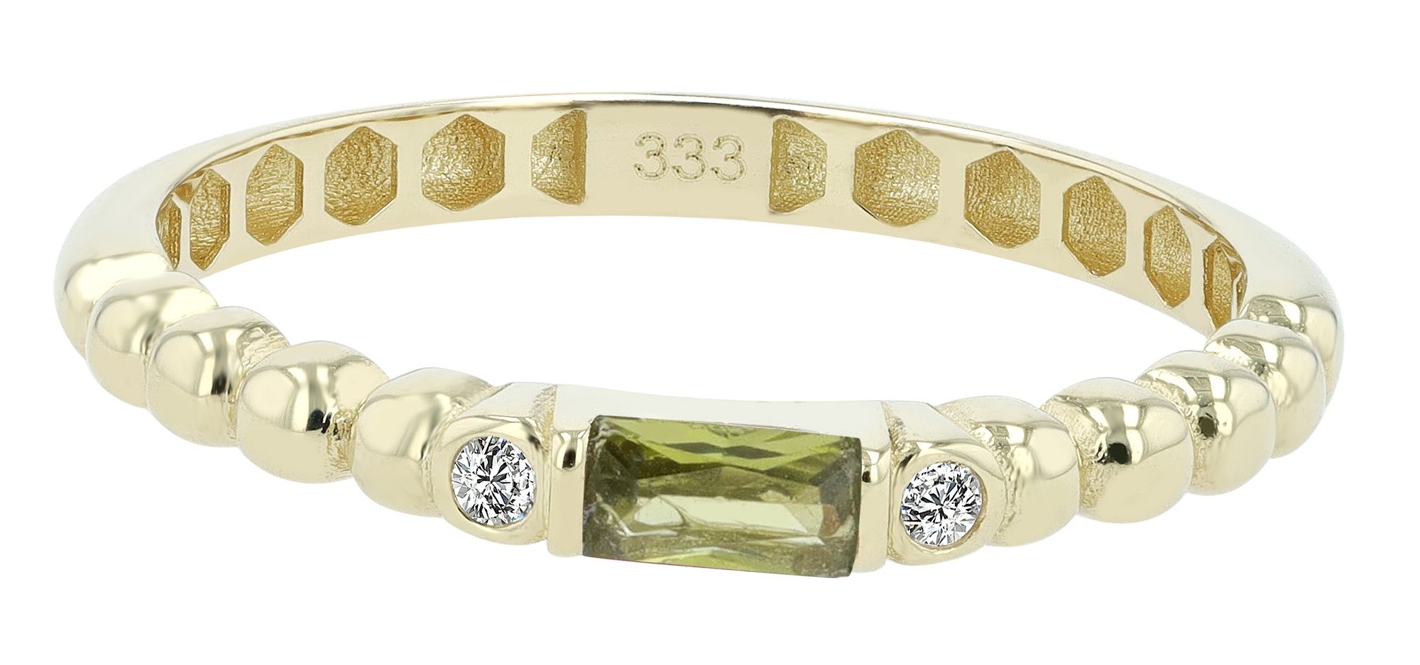De ring heeft een vrouwelijk ontwerp met een 3 x 2 mm olijfgroene zirkonia steen gezet in het midden van de ringband. Naast de olijfgroene zirkonia steen is er aan weerszijden een ronde witte zirkonia steen. Een ander bijzonder kenmerk is dat de ringband bol staat naast de witte zirkonia stenen.