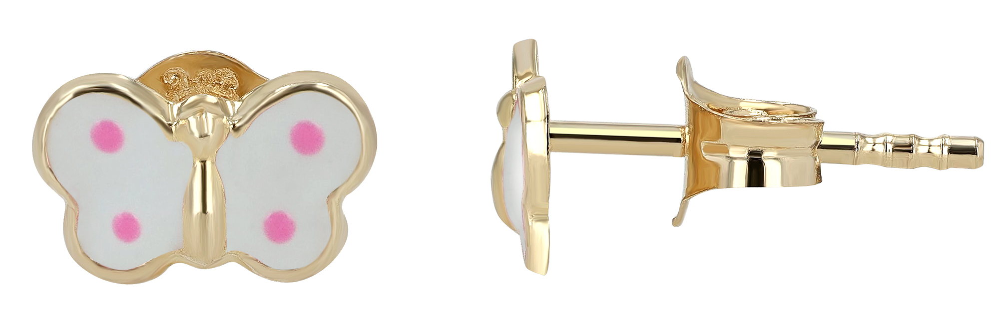 De delicate oorstekers zijn gemaakt van glanzend 333 goud (8 karaat) en betoveren met hun speelse vlinderdesign. Elk paar vleugels is kunstig geëmailleerd en verkrijgbaar in twee betoverende kleurvariaties: goud met wit/rozegoudmet roze/wit. Deze zachte kleurencombinaties geven de vlinders een bijzonder mooie en fantastische uitstraling.