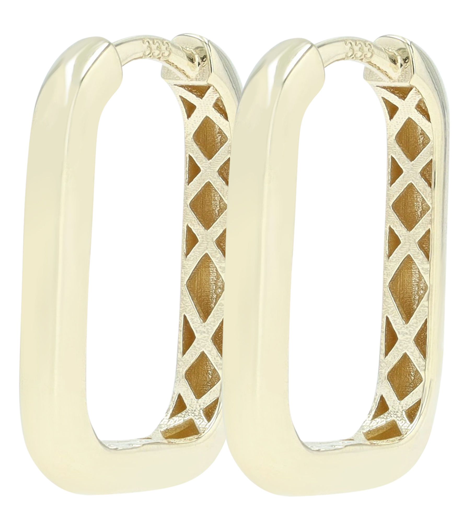 Onze rechthoekige hoepeloorbellen van hoogwaardig 333 geelgoud (8 karaat) zijn de perfecte keuze voor vrouwen die waarde hechten aan strakke lijnen met een zachte afwerking.