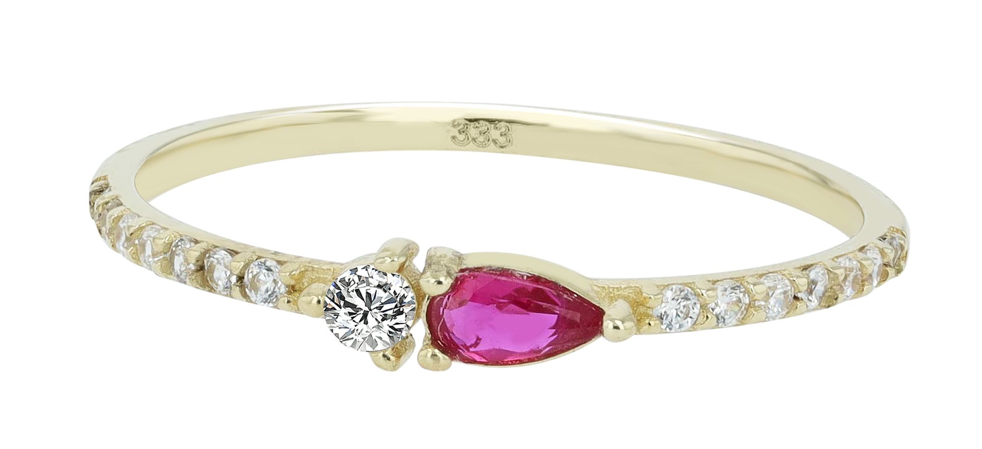 Deze elegante, delicate damesring is gemaakt van 333 goud. Hij is gezet met een roze druppelvormige zirkonia en een ronde witte zirkonia van 2 mm. Er zijn 7 kleine witte zirkonia steentjes rechts en links. De zetting geeft het vingersieraad een bijzondere schittering. Met een breedte van 3 mm en een hoogte van 2 mm past de ring perfect om de vinger. Het sieraad is verkrijgbaar in de maten 52 tot 60 en het tijdloze en discrete ontwerp maakt de ring tot een veelzijdig accessoire voor elke dag en elke gelegenheid. Het sieraad is ook ideaal als cadeau.