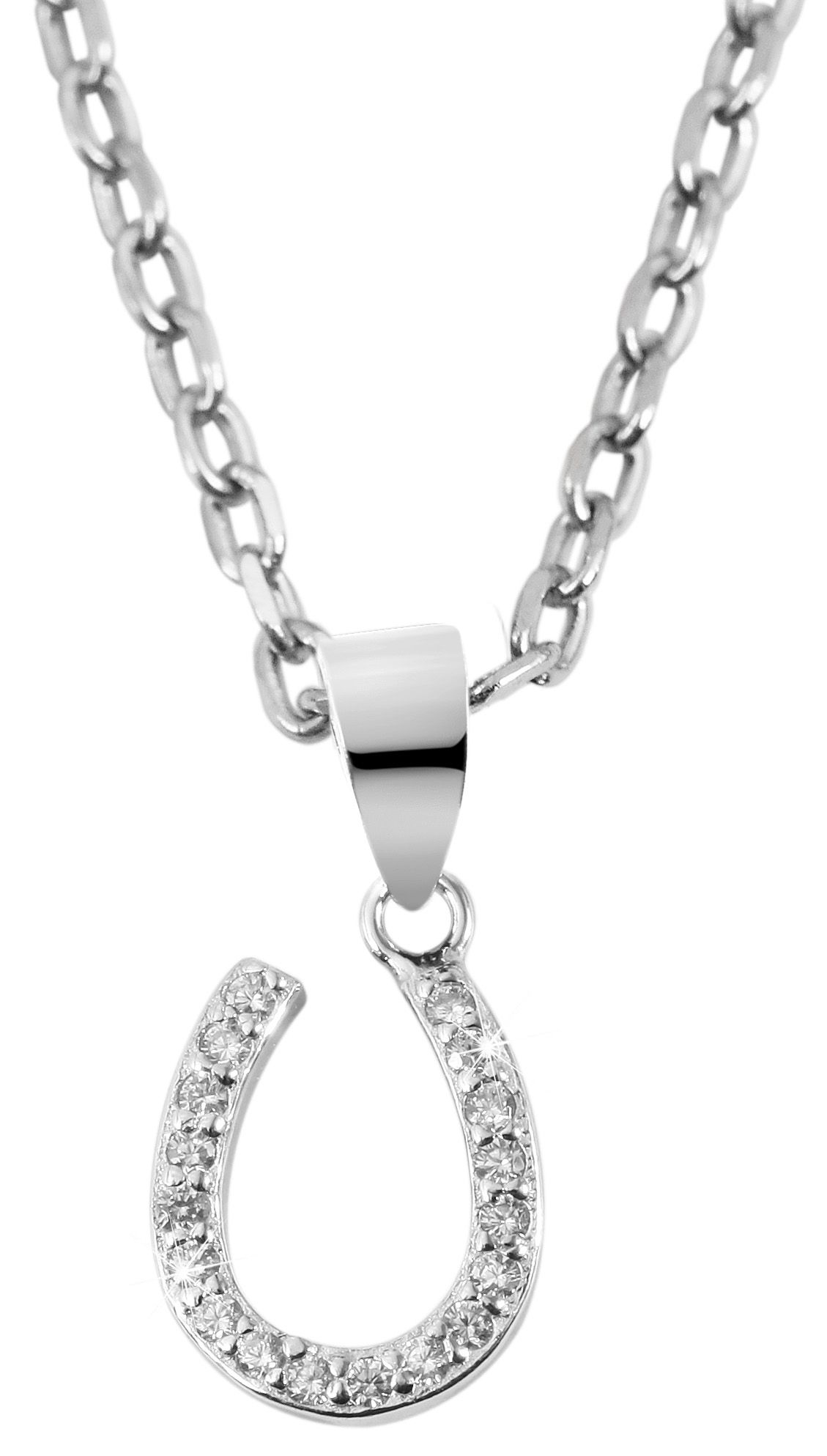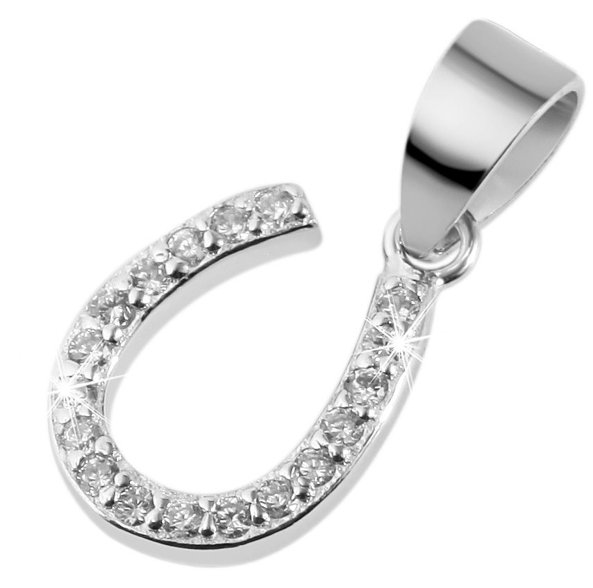 De kettinghanger in de vorm van een hoefijzer van 925 sterling zilver is gerhodineerd, wat betekent dat hij aanslagbestendig is en een stralende glans heeft. Het hoefijzer is versierd met 18 witte zirkonia steentjes. De fonkelende steentjes geven de sierlijke geluksbrenger een elegante uitstraling. De zilveren hanger is 12 mm lang, 9 mm breed en 1,5 mm dik. De sprankelende geluksbrenger is een prachtig accessoire dat voor elke gelegenheid gedragen kan worden en een absolute blikvanger is.