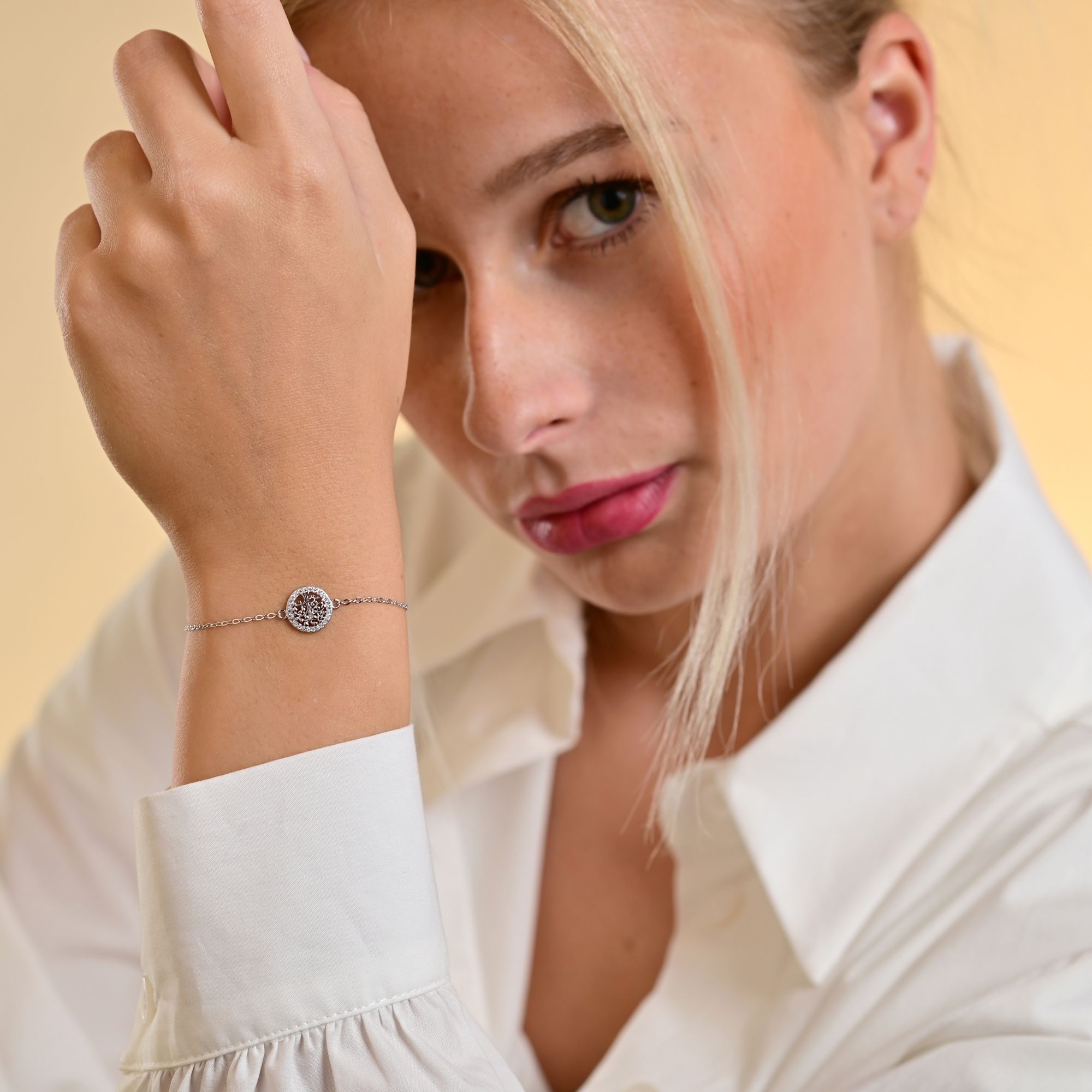 De armband met levensboomhanger is gemaakt van hoogwaardig sterlingzilver en afgewerkt met een edelmetaallaag van rhodium om ervoor te zorgen dat hij zijn glans niet verliest. Met een lengte van 17 cm en een verlengkettinkje van 3 cm past hij perfect om de pols. De hanger is een gedetailleerd kunstwerk met een zirkoniazetting die het boommotief perfect benadrukt. Hij heeft een diameter van 10 mm, waardoor hij een stevige structuur heeft. De armband is voorzien van een praktische veerringsluiting, waardoor hij altijd goed blijft zitten. De levensboom armband symboliseert groei, kracht en verbondenheid met de natuur. Geleverd op een wit juwelenkaartje is het de ideale accessoire voor elke gelegenheid.
