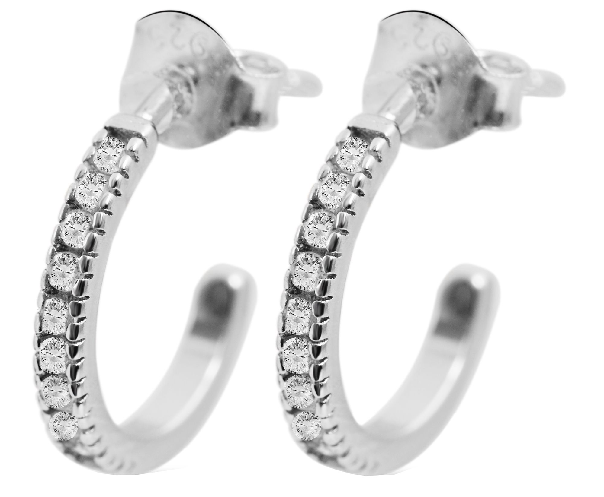 De oorstekers, in de vorm van een halve creool, zijn gemaakt van 925 Sterling zilver en zijn bovendien gerhodineerd. Deze hoogwaardige coating verfijnt het materiaal, beschermt het tegen aantasting en zorgt er ook voor dat het sieraad lang blijft glanzen. De halfronde oorbellen zijn elk volledig bezet met tien zirkonia stenen. Ze zijn tijdloos en stralen tegelijkertijd een elegante charme uit. De oorstekers worden bevestigd met een praktische vleugelschroef, waardoor ze gemakkelijk aan en uit te trekken zijn en goed blijven zitten. De oorbellen zijn 12 mm lang, 2 mm breed en 1,5 mm dik.