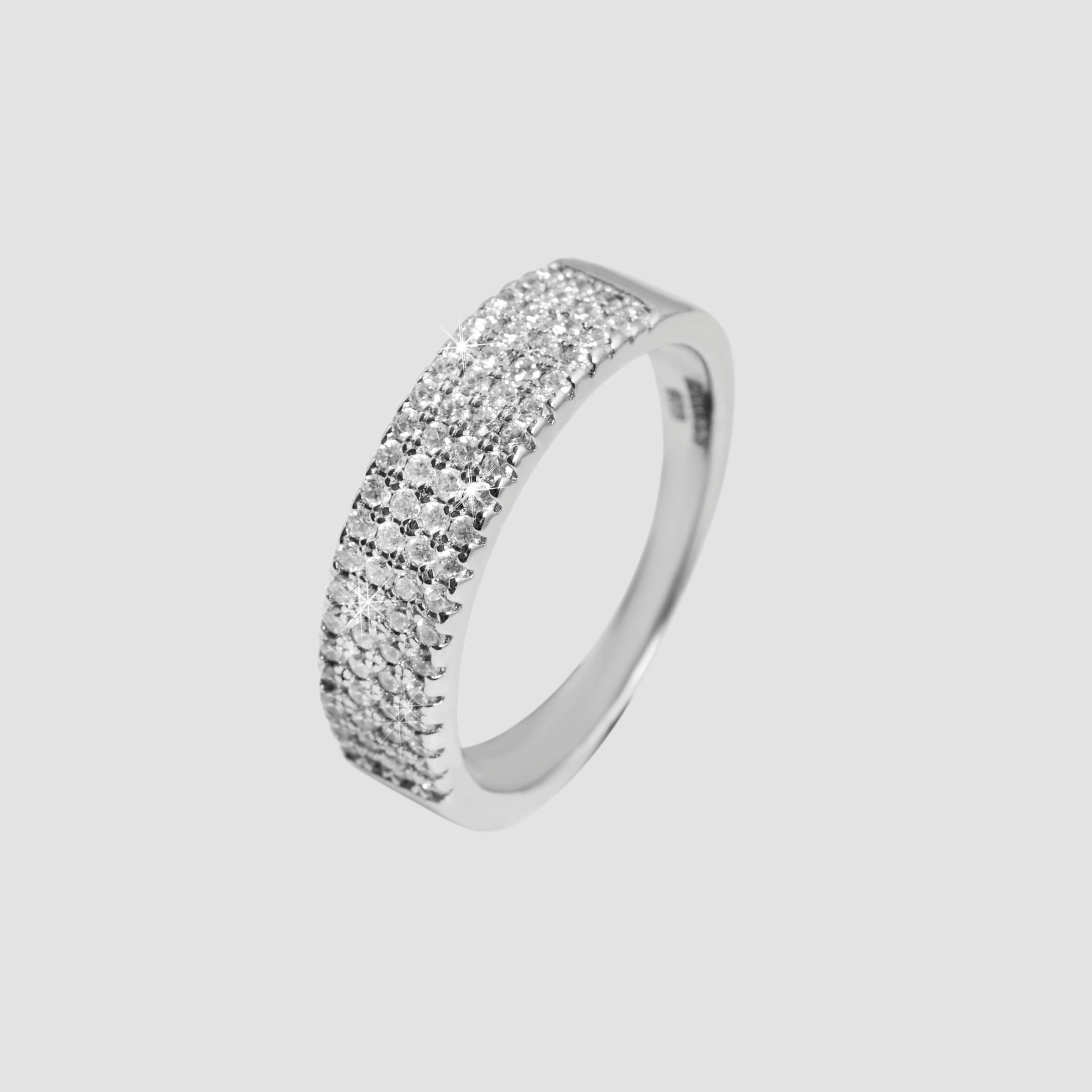 De damesring is gemaakt van 925 sterling zilver en is bovendien gerhodineerd. Deze coating voorkomt dat het materiaal aantast en zorgt bovendien voor een heldere, glanzende look. De elegante maar tijdloze ring is aan de voorkant bezet met vier rijen van 76 fonkelende zirkonia steentjes. Dankzij het klassieke ontwerp kan de ring voor talloze gelegenheden gedragen en gecombineerd worden. Hij kan ook gepersonaliseerd worden met gravures aan de binnenkant. De ringmaat is 58, de ring is 6 mm breed en 2 mm dik.