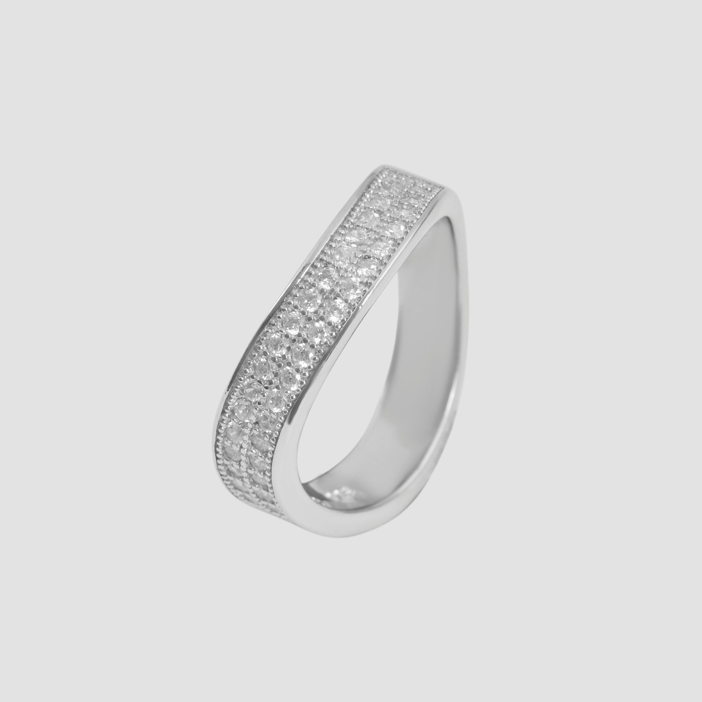 De golfvormige damesring is gemaakt van 925/- sterling zilver en is bovendien gerhodineerd. De hoogwaardige rhodiumplating beschermt de ring tegen aantasting en zorgt ervoor dat het materiaal mooi glanst. De ring is zowel tijdloos als modieus, zodat hij zowel als moderne trouwring als bijzonder sieraad gedragen kan worden. Hij heeft een klassiek, golfvormig ontwerp en is versierd met 38 zirkonia steentjes in twee rijen aan de voorkant. De vrouwelijke ring heeft maat 55, is 4 mm breed en 2 mm dik. Hij heeft ook een lichte bolling aan de binnenkant, waardoor hij comfortabel draagt.