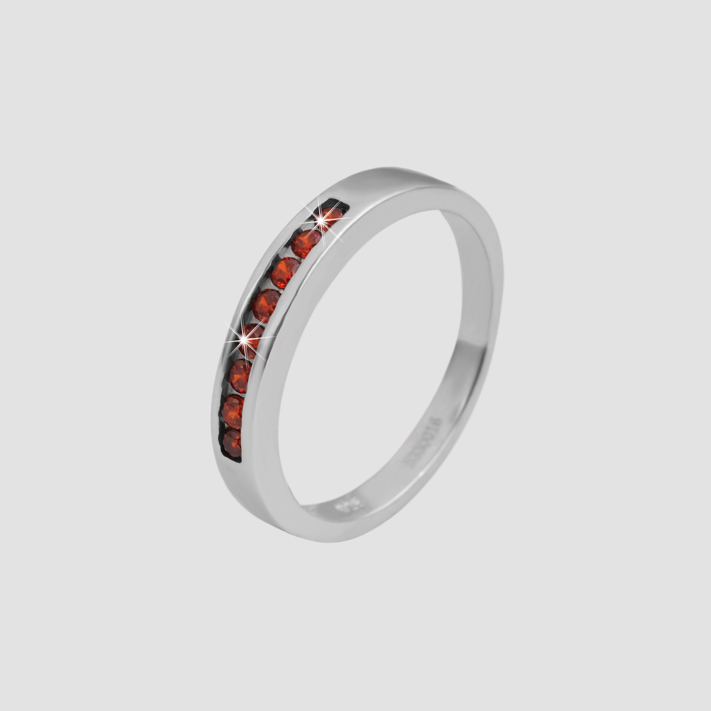 Deze vrouwelijke damesring is gemaakt van 925 sterling zilver en is bovendien gerhodineerd. De hoogwaardige rhodiumplating beschermt het materiaal tegen aantasting en zorgt ook voor een langdurige glans. De ring heeft maat 56, is 3 mm breed en 2 mm dik. Hij is versierd met een rij rode zirkonia steentjes van 1,2 mm in het midden. Deze geven de vingerring een speciale charme en maken het een geweldig accessoire. De ring kan worden gepersonaliseerd met een gravure aan de binnenkant, waardoor het een ideaal cadeau is.