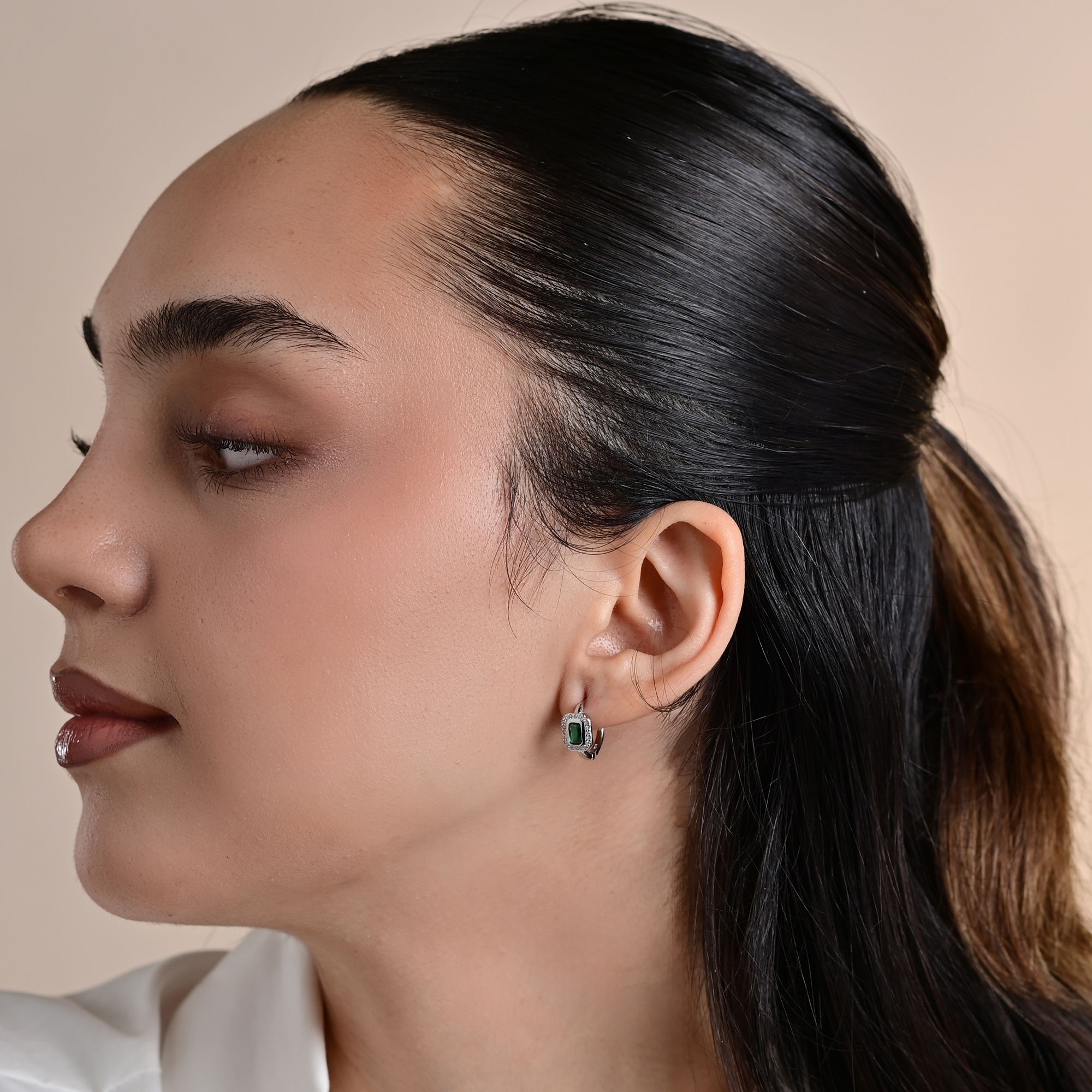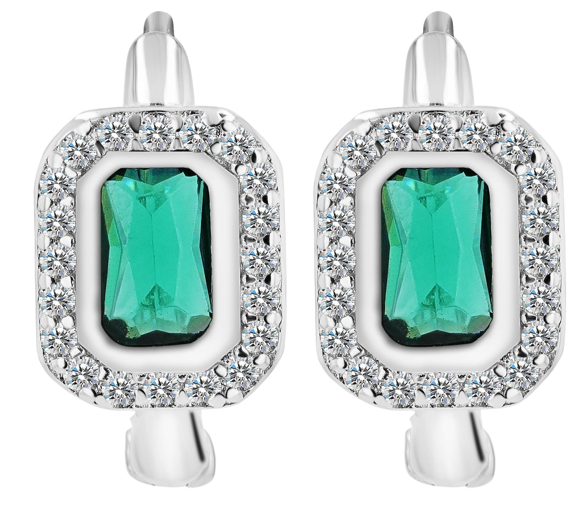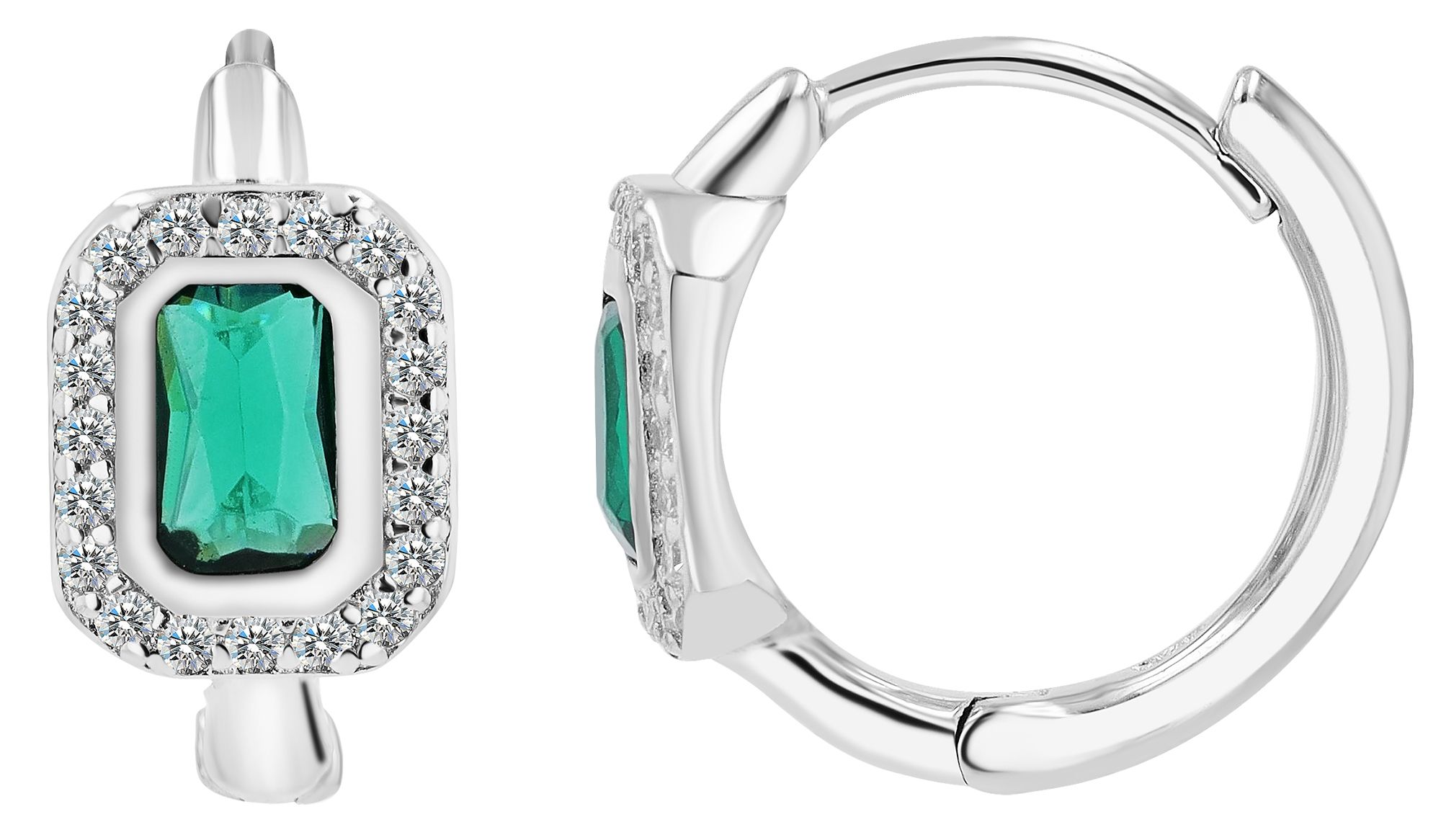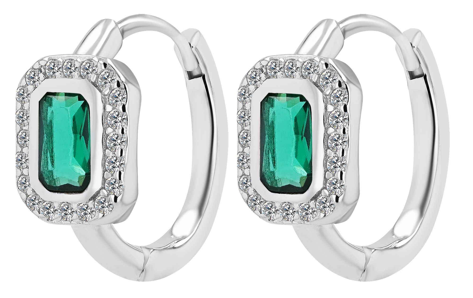 Productinformatie "925/- Echt zilveren scharnierende hoepel oorbellen "Liora" met groene en witte zirkonia, gerhodineerd"