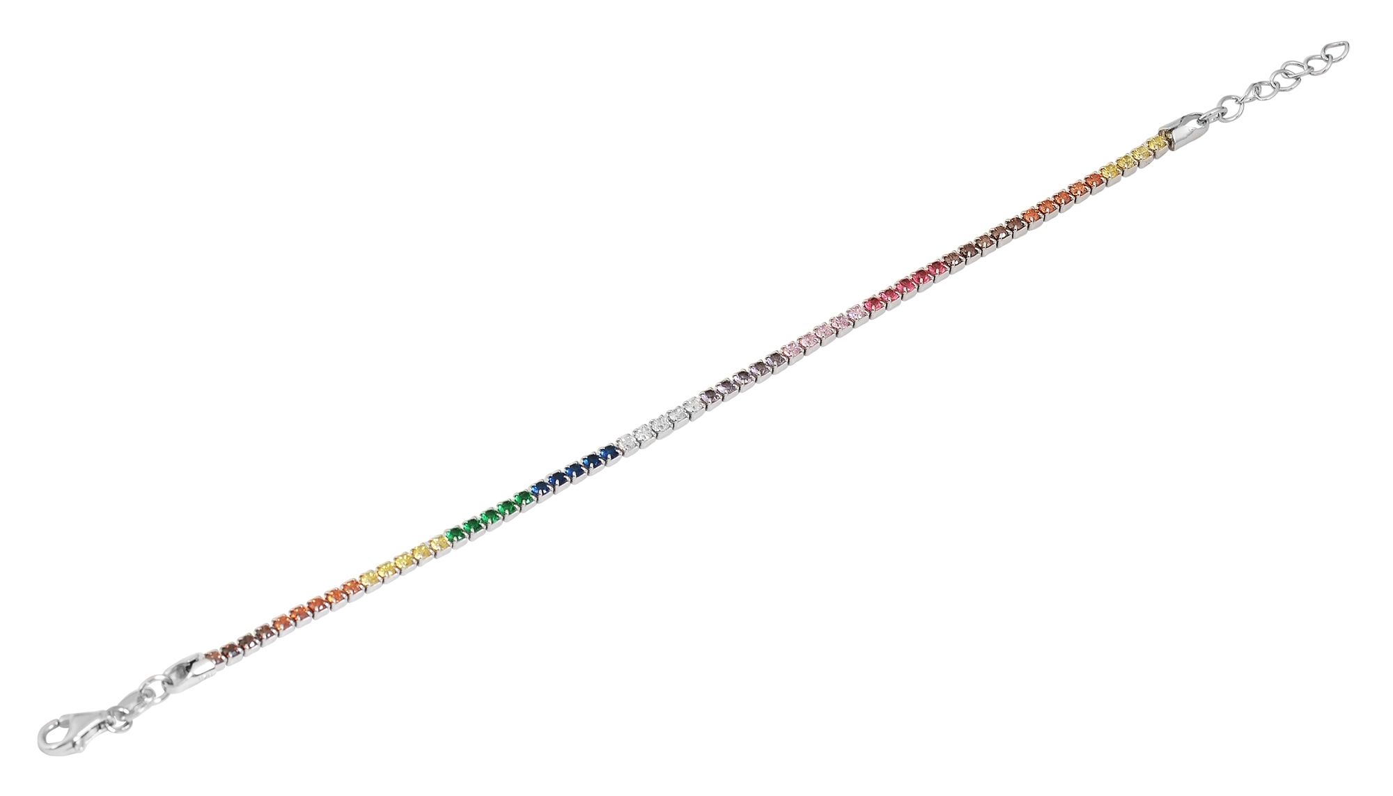 De kleurrijke armband met een kleurrijke zirkonia is gemaakt van 925 Sterling zilver en is ook gerhodineerd. Dankzij de coating behoudt het materiaal lang zijn stralende glans. De zilveren armband heeft een lengte van 17 cm en een breedte en dikte van 2 mm. Dankzij een verlengkettinkje van 3 cm kan de armband naar wens worden aangepast aan de pols en eenvoudig worden vastgemaakt met een echt zilveren karabijnsluiting. De zetting bestaat uit 58 kleurrijke zirkonia steentjes, waarvan de kleur regelmatig wordt herhaald. De bonte mix van fonkelende steentjes maakt de armband tot een bijzonder highlight en is niet meer weg te denken uit je pols.