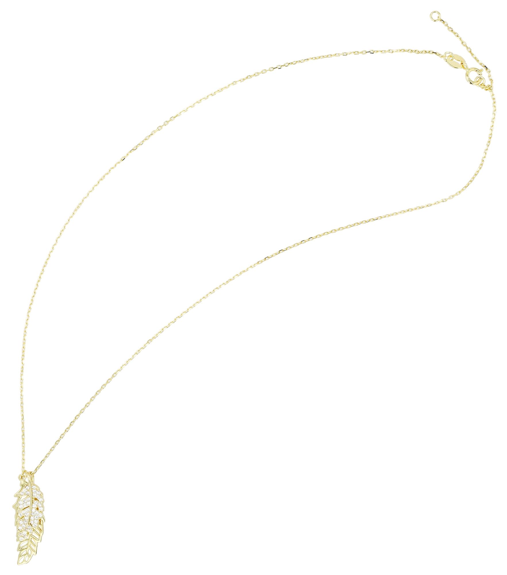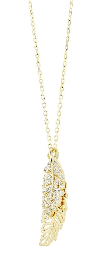Deze betoverende ketting met twee bladvormige hangers is gemaakt van verguld 925 Sterling zilver. Elke hanger is een artistiek meesterwerk en verleent het sieraad een onvergelijkbare elegantie. Het grote blad, met zijn eenvoudige schoonheid en afmetingen van 25 x 8,5 x mm, fascineert door zijn gedetailleerde afbeelding. Elke fijne lijn is zorgvuldig gemaakt om de natuurlijke schoonheid van het blad te vangen. Het kleinere blad, met afmetingen van 19,5 x 7 x2 mm, schittert met een zetting van 45 glinsterende kubieke zirkonia. Deze stenen fonkelen en weerkaatsen het licht met een adembenemende schittering. De delicate ketting heeft een totale lengte van 40 cm plus 3,5 cm verlenging en een dikte van 1 mm. Het verlengstuk kan worden aangepast en is comfortabel om te dragen. De ketting is eenvoudig te bevestigen met een karabijnsluiting. Deze tijdloze ketting geeft elke outfit een individuele look en onweerstaanbare charme. Hierdoor is het een stijlvol accessoire voor elke gelegenheid.