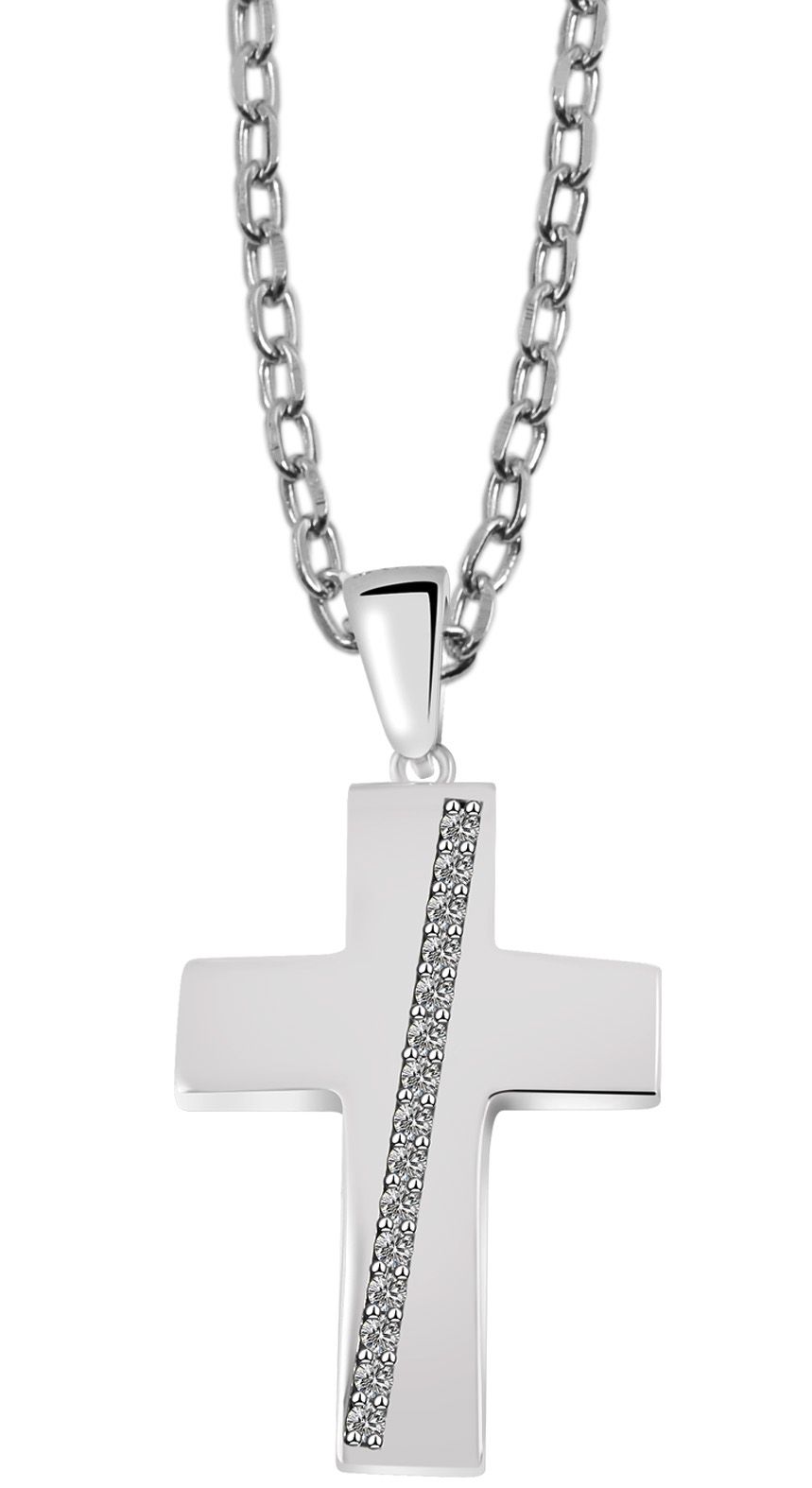 De hanger in de vorm van een kruis is gemaakt van 925/- sterling zilver. De hele hanger is gerhodineerd. Dit betekent dat er een hoogwaardige edelmetalen laag overheen zit die het sieraad beschermt tegen aantasting. De rhodium benadrukt ook de zilvertint en geeft het een perfecte glans. De fonkelende zirkonia steentjes en de gedeeltelijk gepolijste oppervlakteafwerking dragen hier ook aan bij. De andere helft van het kruis heeft een matte afwerking. Dankzij het ovale oogje kan de zilveren hanger aan veel verschillende kettingen worden bevestigd. Let op: de ketting wordt niet meegeleverd. De afmetingen komen voort uit een lengte van 29 mm, een breedte van 19 mm en een materiaaldikte van 3 mm. De hanger is ideaal als cadeau, bijvoorbeeld voor een doop, communie of kerst.
