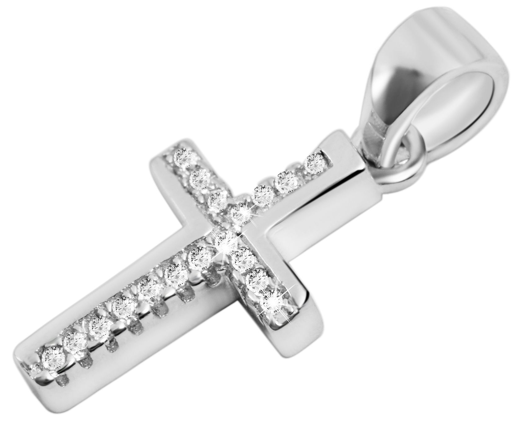 De kettinghanger in de vorm van een kruis is gemaakt van 925/- sterling zilver en heeft een extra rodium coating. Deze hoogwaardige coating beschermt het sieraad tegen aantasting en geeft het een bijzonder hoge glans. Het kruis is versierd met 18 zirkonia steentjes. De fonkelende stenen zijn rechts en links gelijk met de bovenrand van de hanger gezet, zodat de zirkonia steentjes gecompenseerd zijn. Dankzij een ovaal oogje kan de hanger naar wens aan verschillende kettingen worden bevestigd. Houd er bij de aankoop van dit product rekening mee dat de hanger zonder ketting wordt geleverd. De zilveren hanger is 17 mm lang, 10 mm breed en 3 mm dik. Dit product wordt geleverd op een wit juwelenkaartje. De afmetingen zijn 45 x 35 mm en ideaal om te presenteren in een passende display of om cadeau te geven.