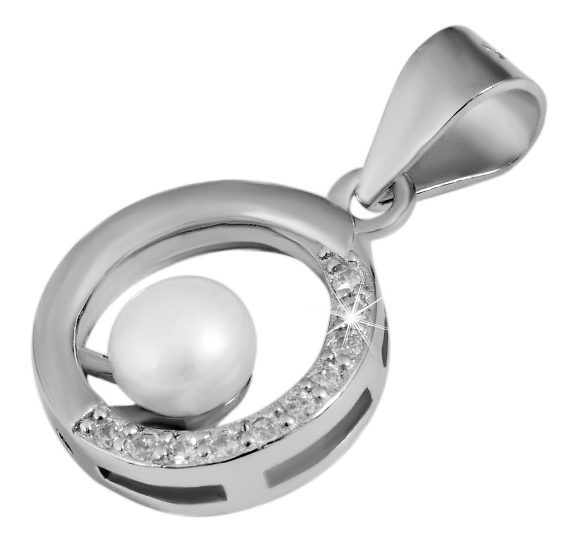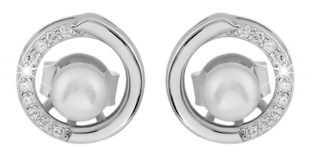 Dames parelsieraden set in 925 zilver/gerhodineerd met aanslagbescherming 2,8 gram, bestaande uit ronde hanger & oorstekers met 30 zirkonia steentjes. Diameter parel: 4,5 mm, diameter hanger: 11 mm, dikte: 4,5 mm, diameter oorsteker: 10 mm, dikte: 4,5 mm.