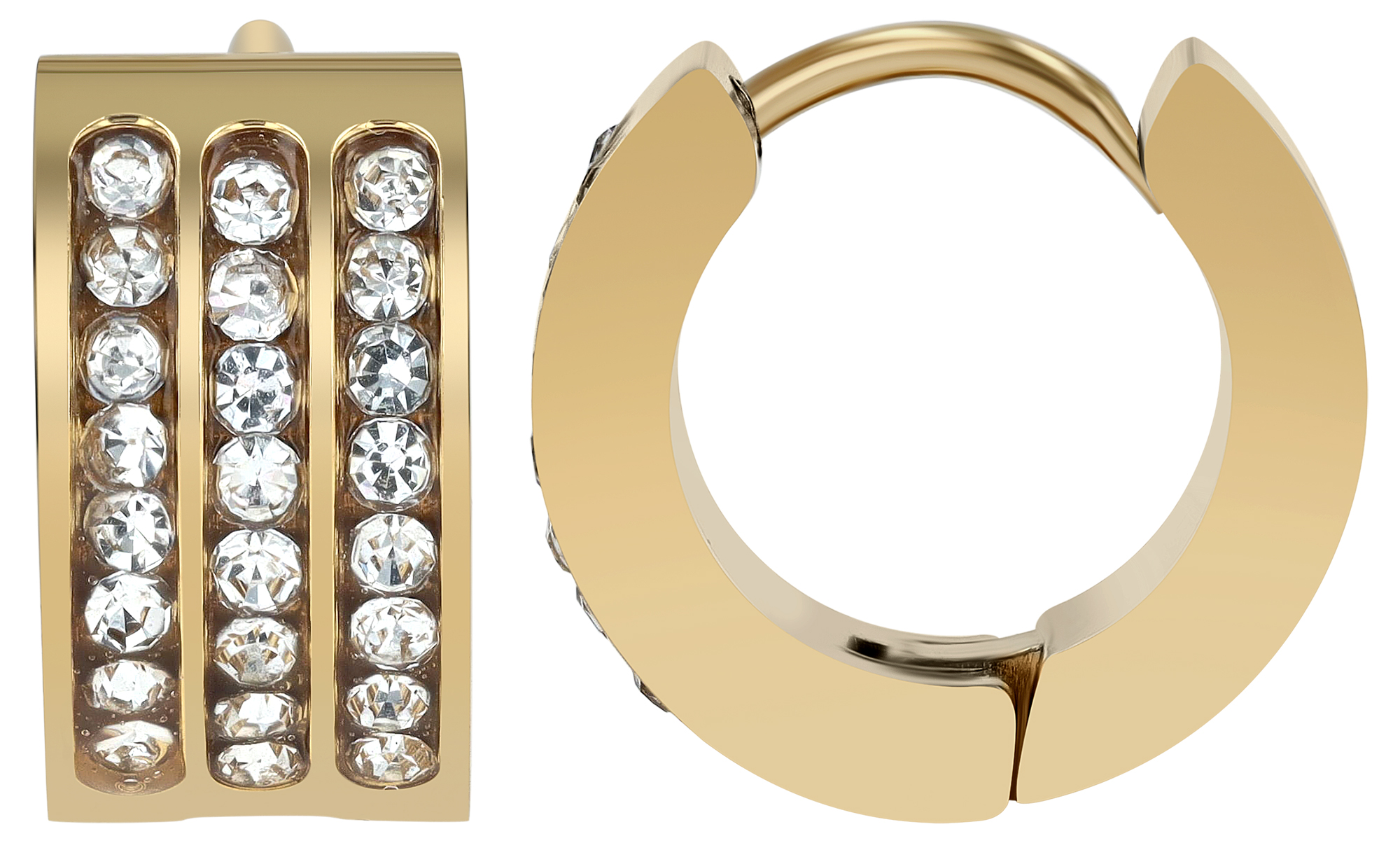 Productinformatie ""Abebi" roestvrij stalen scharnierende hoepel oorbellen, similé zetting, Ø 9 mm, goudkleurig"