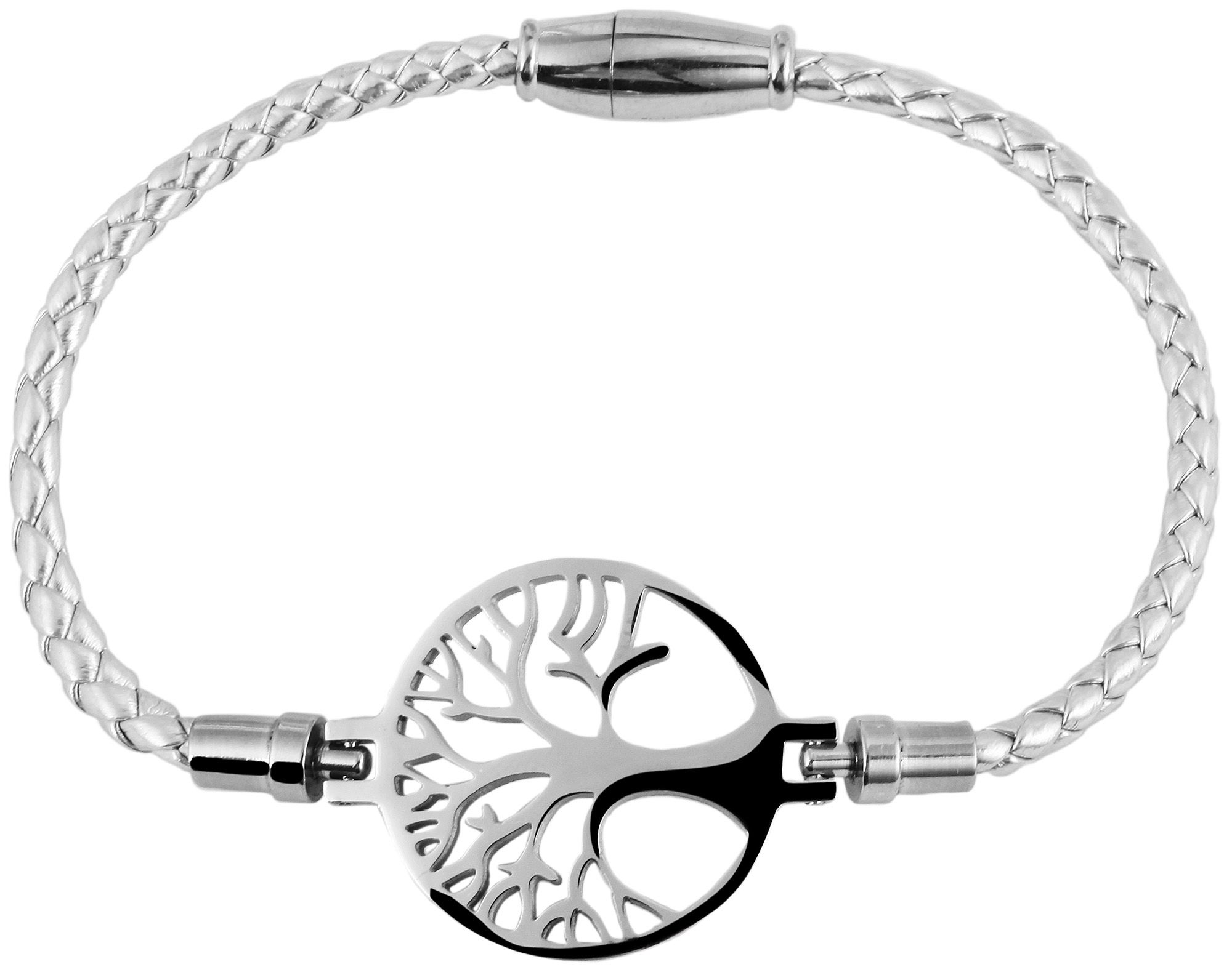 De zilverkleurige echt lederen armband van het merk Akzent is gemaakt van een gevlochten echt lederen band. In het midden is een zilverkleurig roestvrijstalen element verwerkt in de vorm van een cirkel met daarin een levensboom. De moderne sieradenarmband kan worden geopend en gesloten met een praktische magneetsluiting. De totale lengte van de armband is 18 cm, hij is 9 mm breed en het stalen element is 2 mm dik.