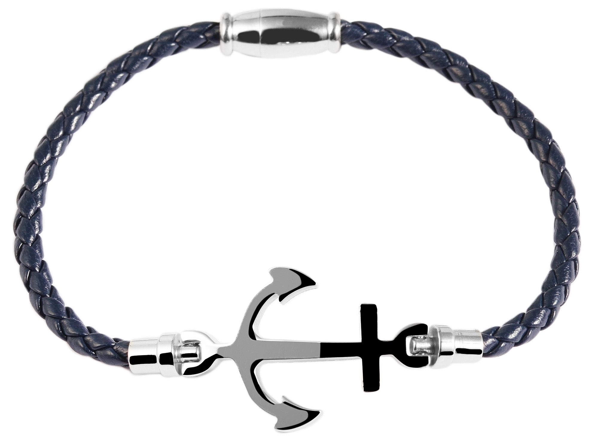 De donkerblauwe armband van echt leer van het merk Akzent is gemaakt van een gevlochten band van echt leer. In het midden is een zilverkleurig roestvrijstalen element in de vorm van een anker bevestigd. Dit is gepolijst en geeft de armband een bijzondere, maritieme look. De moderne sieradenarmband kan worden geopend en gesloten met een magneetsluiting. De totale lengte van de armband is 18 cm en het roestvrijstalen element is 1,8 cm breed.