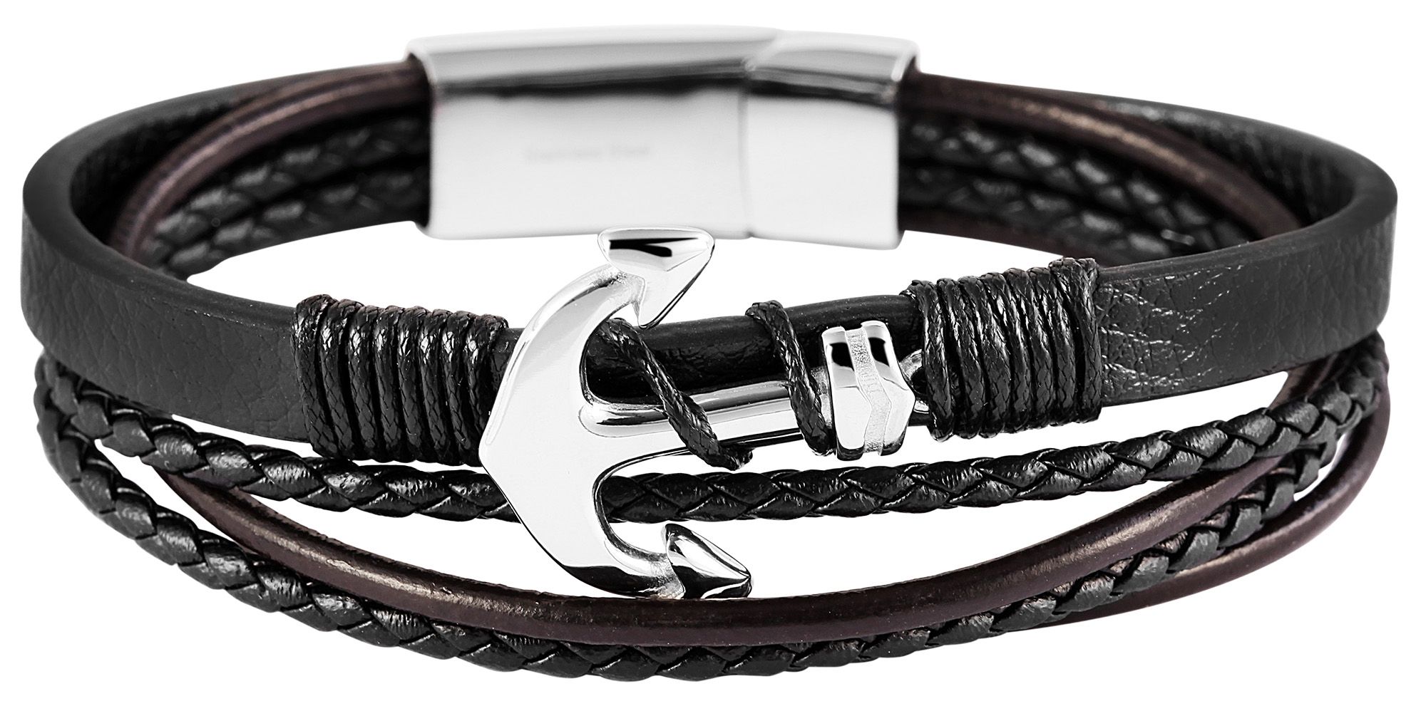 De zwarte armband van echt leer van het merk Akzent heeft een ontwerp met vier rijen. Het heeft een centrale 10 mm brede streng en drie 3 mm dikke ronde strengen, waarvan twee gevlochten en één glad. Een zilverkleurig roestvrijstalen element in de vorm van een anker is aan het midden van de middelste streng bevestigd met een dunne draad van echt leer. De modieuze armband van echt leer heeft een lengte van 20,5 cm. Hij kan worden geopend en gesloten met een praktische roestvrijstalen magneetsluiting. De sieradenarmband is een absolute blikvanger en kan op verschillende manieren worden gecombineerd.