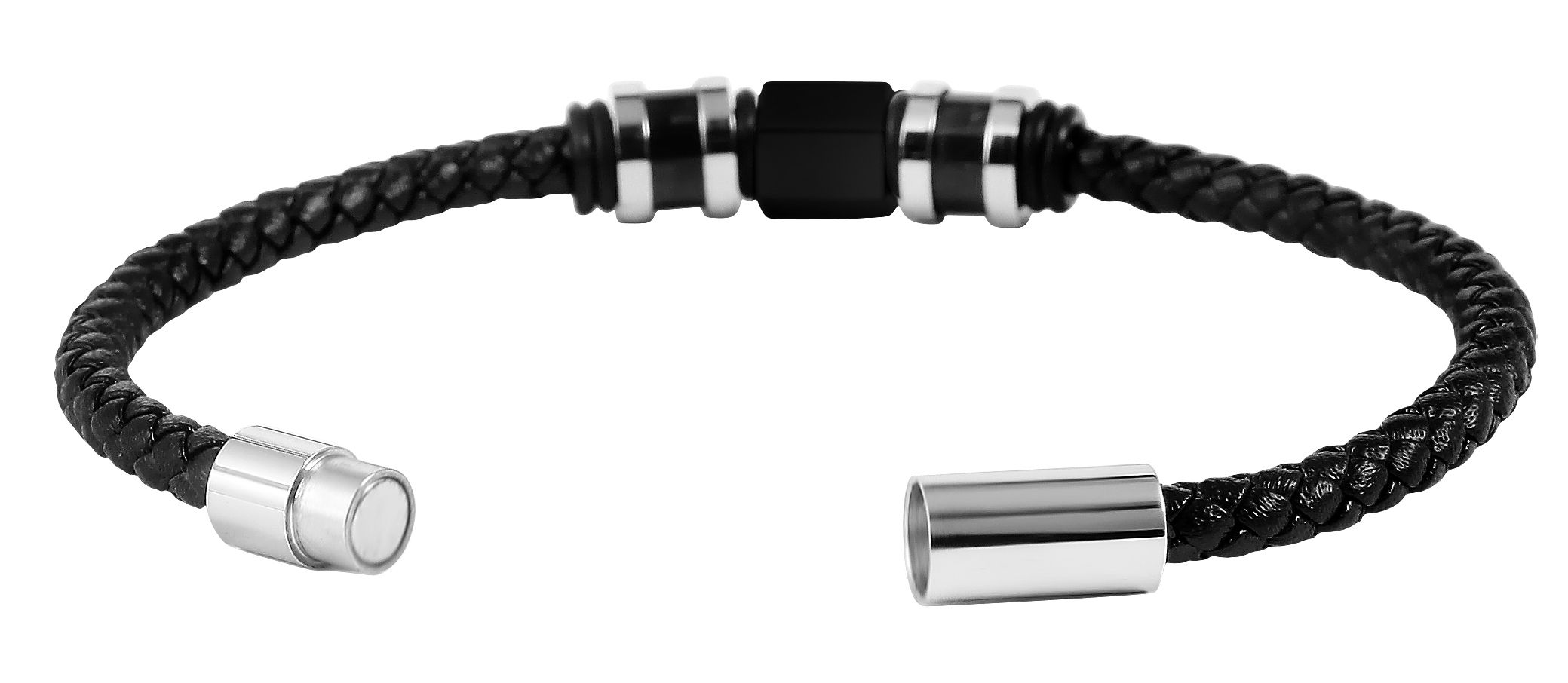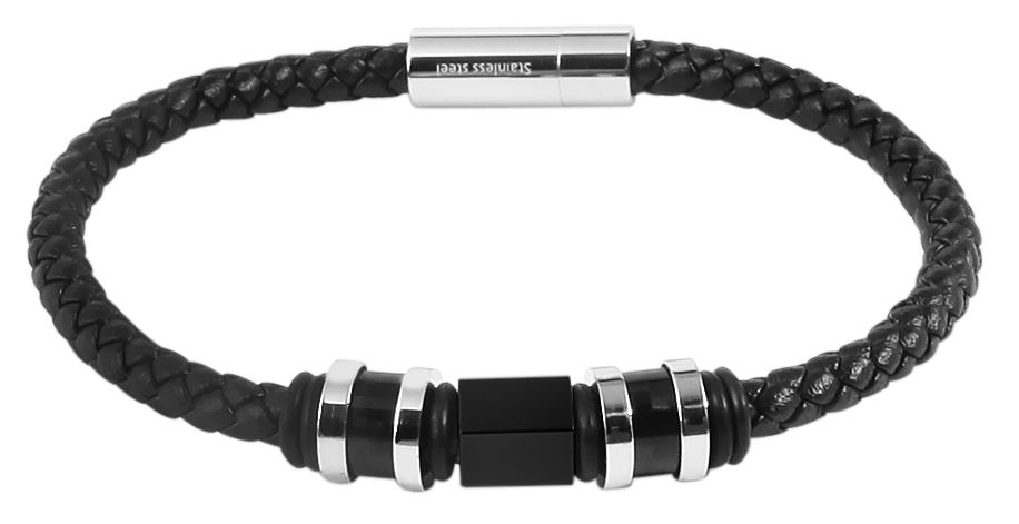 De Akzent armband is gemaakt van echt leer en heeft een totale lengte van 21,5 cm. De leren armband bestaat uit een 5 mm breed gevlochten leren koord, dat in het midden is versierd met roestvrijstalen, carbon elementen en rubberen ringen. Deze elementen vallen goed op en ronden het ontwerp van de armband af. De armband kan gemakkelijk worden geopend en gesloten met een praktische magneetsluiting en kan ook worden gepersonaliseerd met kleine gravures. Leer en roestvrij staal maken dit accessoire bijzonder modern en het slaat een mooi figuur om zowel mannelijke als vrouwelijke polsen. Deze armband is het perfecte accessoire om je outfit compleet te maken en is bijzonder huidvriendelijk dankzij de natuurlijke en hoogwaardige grondstoffen.