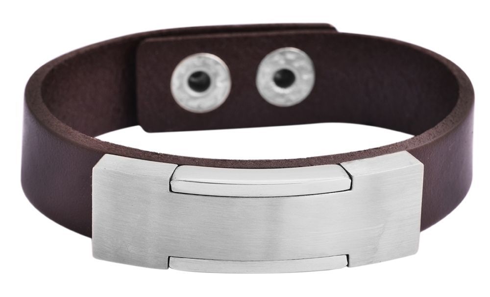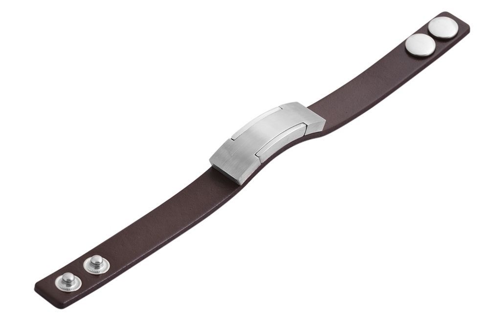 De bruine echt leren armband van het merk Akzent is gemaakt van een 1,5 cm brede leren band. Het is versierd met een zilverkleurig roestvrijstalen element in het midden. Dit heeft twee smalle contrasterende elementen aan de buitenranden, die de armband een beetje breken. De totale lengte van de moderne sieradenarmband is 22 cm en hij is 8 mm dik. Hij kan worden geopend en gesloten met twee zilverkleurige drukknopen, waarmee ook de breedte van de armband kan worden aangepast. Het roestvrijstalen element is geschikt om te graveren. Een gepersonaliseerde armband is een geweldig cadeau.
