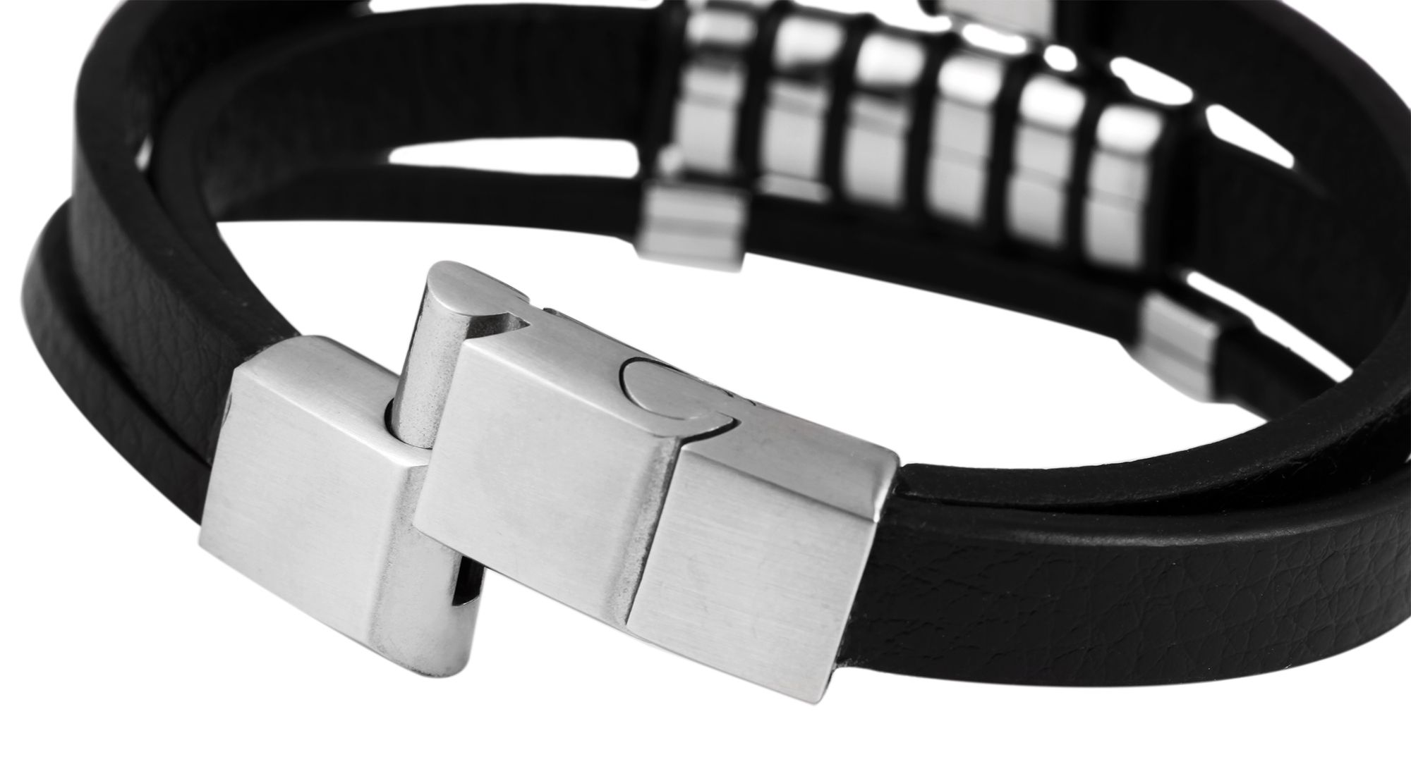 De zwarte band van echt leer is gemaakt van drie leren banden van verschillende breedtes. De smalste is versierd met twee beweegbare vierkante stalen elementen, de middelste met een ovaal element en de breedste band is versierd met zes smalle ovale roestvrijstalen elementen. Alle stalen elementen zijn zilverkleurig. De moderne sieradenarmband kan worden geopend en gesloten met een zilverkleurige roestvrijstalen magneetsluiting. De totale lengte is 23 cm, de breedte 2 cm en de dikte 0,8 cm. Een element van 1 cm kan van de magnetische sluiting worden verwijderd. Hierdoor kan de totale lengte met 1 cm worden ingekort tot 22 cm. Deze modieuze armband is een geweldige metgezel voor dagelijks gebruik en is ook een geweldig cadeau.