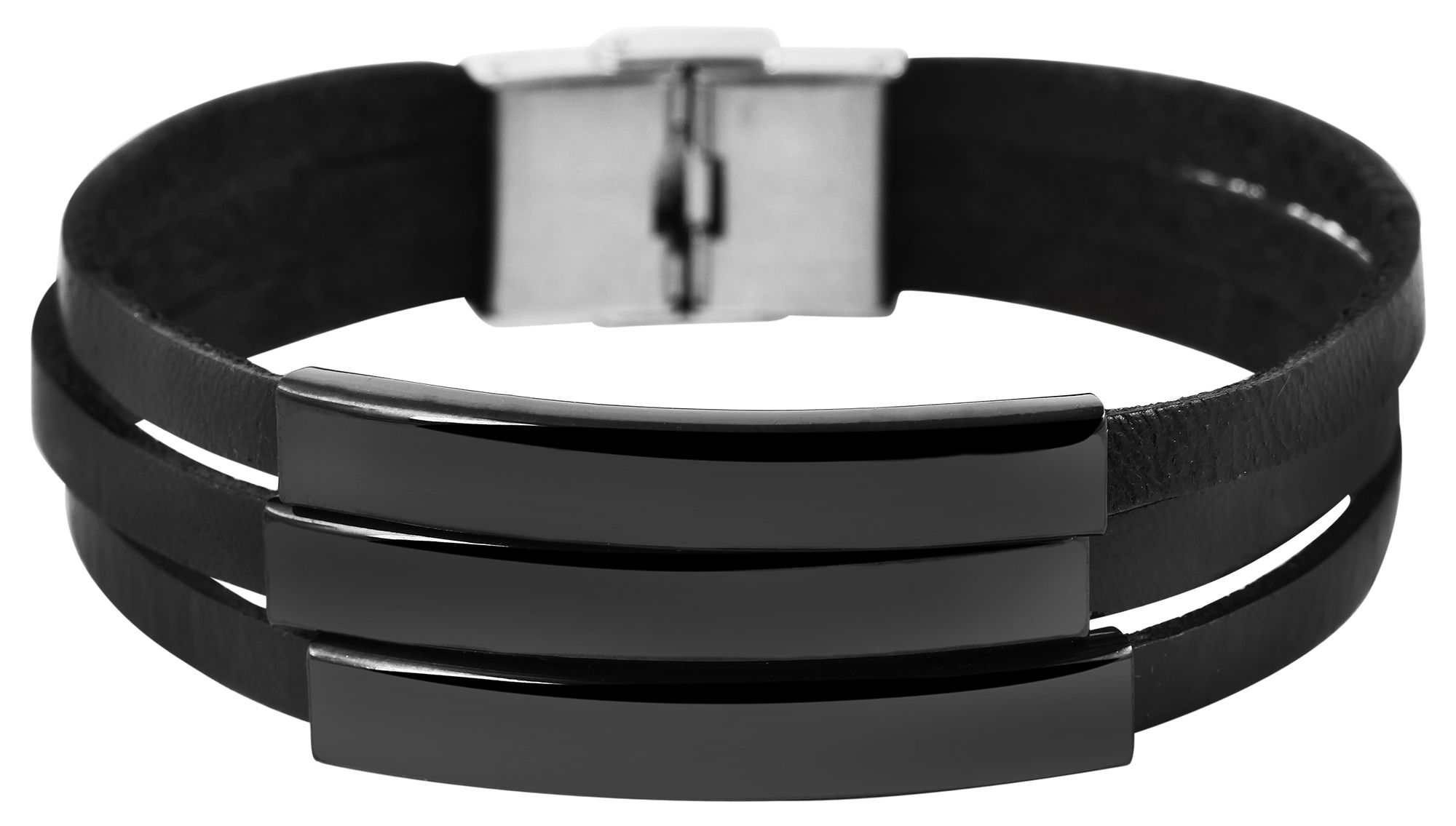 De sieradenarmband van het merk Akzent is gemaakt van drie zwarte, echt leren bandjes. Deze zijn 5 mm breed en hebben een glad oppervlak. Aan elk bandje is een zwart roestvrijstalen element bevestigd met een lengte van 41 mm, een breedte van 6,5 mm en een dikte van 5 mm, dat glanst en ideaal is om te graveren. De modieuze armband kan worden geopend en gesloten met een zilverkleurige haaksluiting, die ook van roestvrij staal is gemaakt. De leren armband is 21,5 cm lang, 20 mm breed en 5 mm dik.