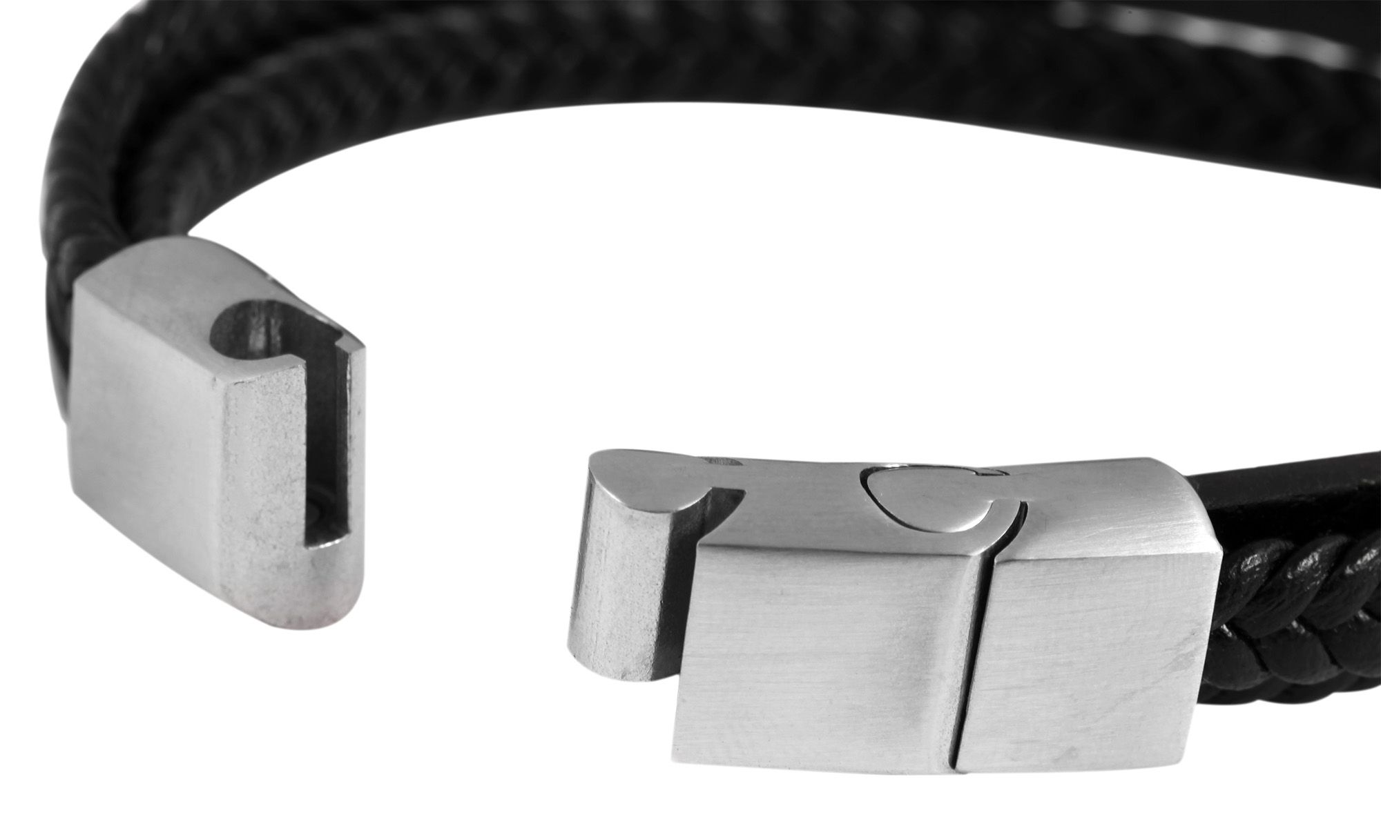 Deze zwarte sieradenarmband van het merk Akzent is gemaakt van drie echt leren bandjes. Twee zijn plat gevlochten en één heeft een glad oppervlak en is smal. Aan de gladde bandjes is een smal goudkleurig roestvrijstalen element bevestigd, dat ideaal is om te graveren. De modieuze armband kan worden geopend en gesloten met een zilverkleurige magneetsluiting, die ook van roestvrij staal is gemaakt. De afmetingen van de leren armband zijn 23 cm lang, 1,8 cm breed en 3 mm dik. Het is mogelijk om een element van 1 cm van de magnetische sluiting te verwijderen om de totale lengte in te korten tot 22 cm. De moderne sieradenarmband is ideaal als gepersonaliseerd cadeau.
