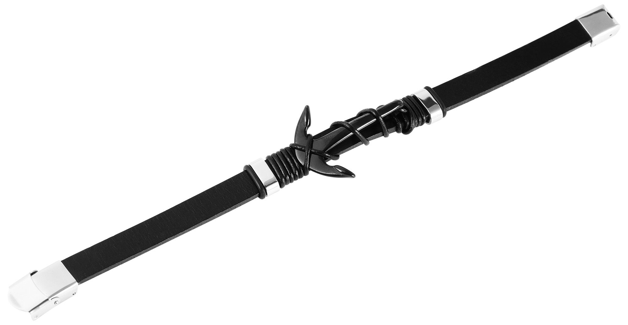 De zwarte Akzent sieradenarmband bestaat uit een 13 mm brede band van echt leer die geopend en gesloten kan worden met een zilverkleurige roestvrijstalen haaksluiting. De armband is versierd met een zwart ankerelement in het midden. Dit wordt om de armband gewikkeld met een smal, rond bandje van echt leer, dat ook zwart is. Het maritieme sieraad is ook versierd met twee zilverkleurige roestvrijstalen oogjes. De moderne armband is een geweldige metgezel voor dagelijks gebruik en kan perfect worden gecombineerd met elke kledingstijl. De totale lengte is 23 cm.