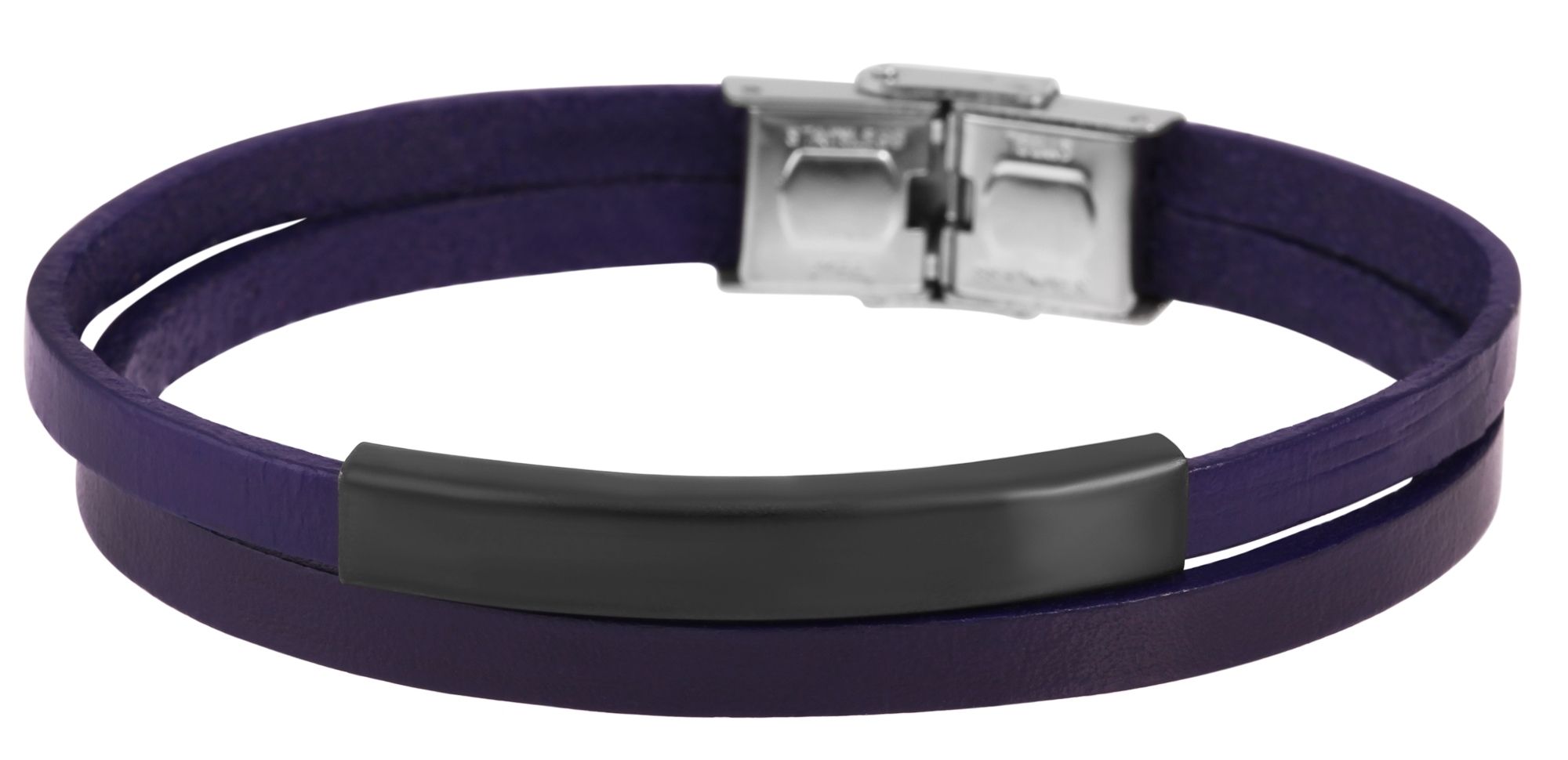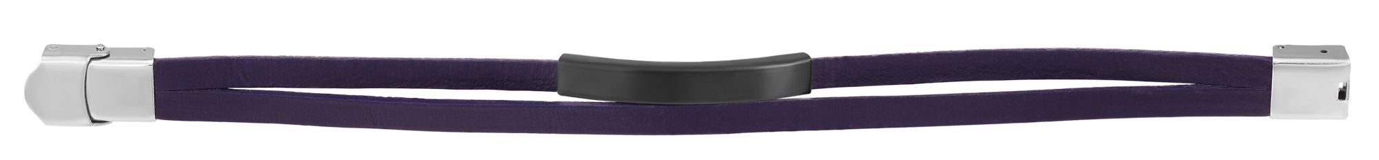 De violetkleurige Akzent sieradenarmband is gemaakt van twee platte banden van echt leer. Aan een van de twee leren banden is een eenvoudig zwart roestvrijstalen element bevestigd, dat een matte afwerking heeft en ideaal is om te graveren. De modieuze armband kan worden geopend en gesloten met een zilverkleurige haaksluiting, die ook van roestvrij staal is gemaakt. De afmetingen resulteren in een totale lengte van 21 cm, een breedte van 1,2 cm en een hoogte van 5 mm. Een gepersonaliseerd sieraad is een geweldig cadeau.