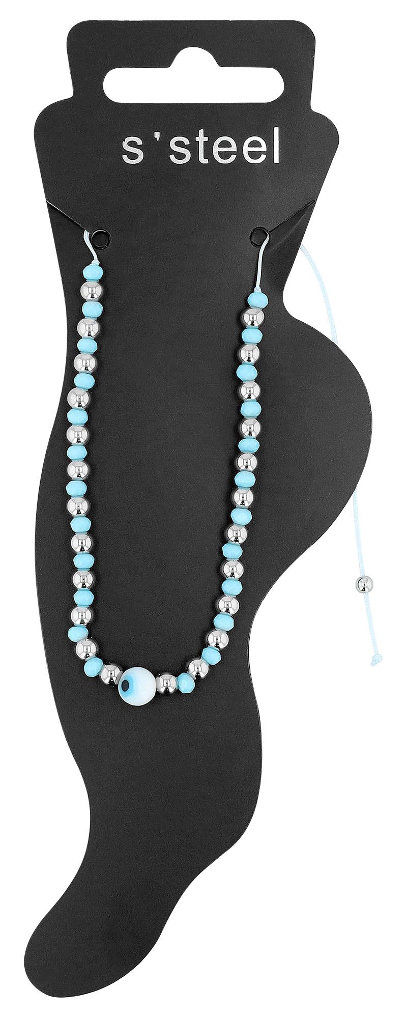 Deze enkelband is gemaakt van een delicaat stoffen bandje versierd met glanzend roestvrij staal en sierlijke imitatieparels en is een lust voor het oog. Het hoogtepunt is de imitatieparel in het midden, die is versierd met een nazaroog. Een ander praktisch kenmerk is de verstelbare treksluiting, waarmee de lengte van de enkelband kan worden aangepast. Op zijn smalst heeft de enkelband een diameter van 5 cm, wat zorgt voor een comfortabele en stevige pasvorm.