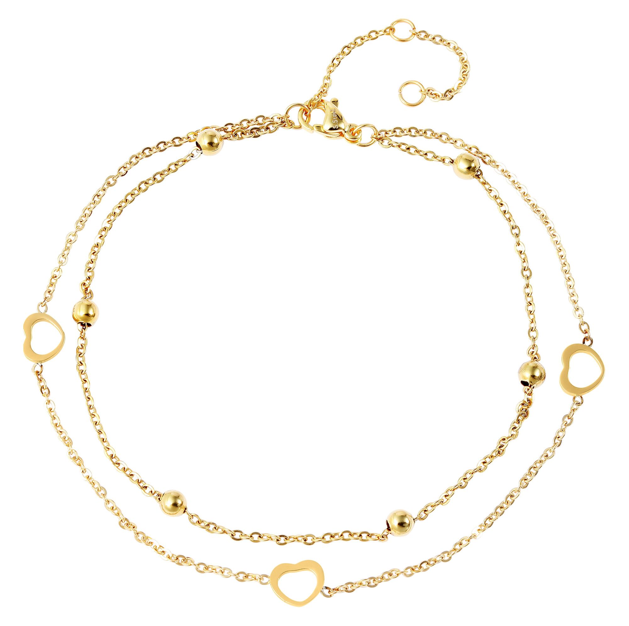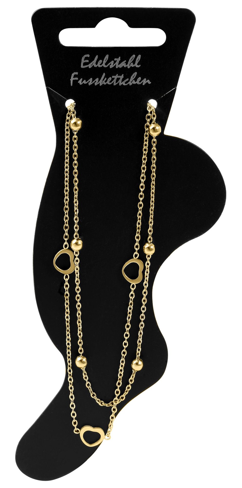 Deze enkelband van het merk Akzent is gemaakt van roestvrij staal en bestaat uit twee ankerkettingen van verschillende lengtes. Kleine roestvrijstalen bolletjes zijn gelijkmatig verdeeld over een van de kettingen. Aan één uiteinde is ook een verlengkettinkje van 2,5 cm bevestigd, waarmee je de lengte individueel kunt variëren en aanpassen aan elke enkel. De andere ketting is versierd met kleine hartjes. Samen vormen de twee kettingen een moderne enkelband. De speelse enkelband kan worden geopend en gesloten met een karabijnsluiting, die ook van roestvrij staal is gemaakt. De afmetingen komen voort uit een lengte van 25 cm en een kettingdikte van 1 mm. Het moderne enkelsieraad maakt elke outfit af en is ook een geweldig cadeau. Bijvoorbeeld voor een verjaardag, Kerstmis of Valentijnsdag.