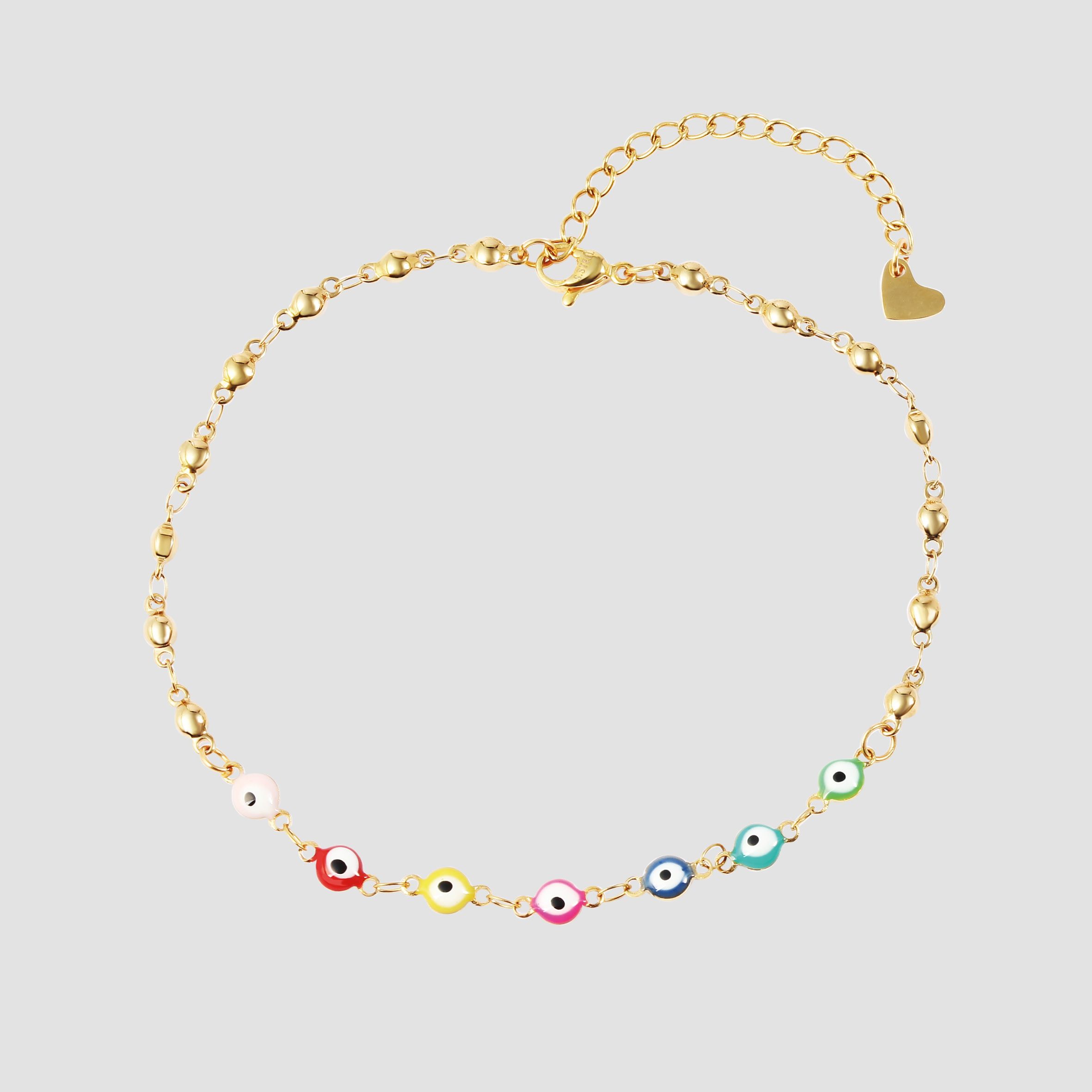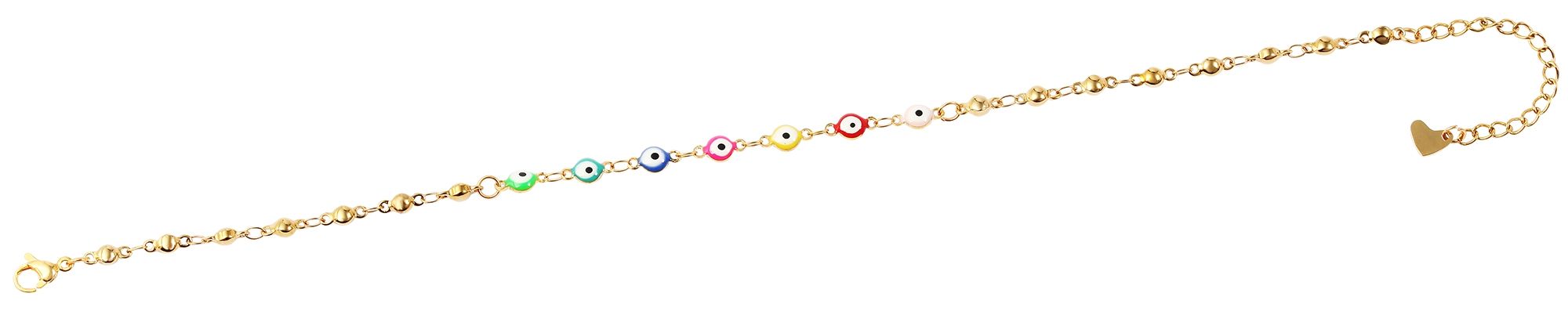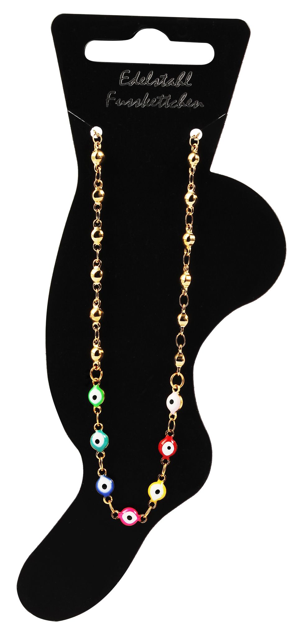 De Akzent enkelband is gemaakt van roestvrij staal en is verkrijgbaar in verschillende kleuren. De karabijnsluiting waarmee de enkelband aan de enkel kan worden bevestigd, is ook van roestvrij staal. Het is gelijkmatig verdeeld met in totaal 22 hangers in de vorm van kralen, waarvan er zeven kleurrijk versierd zijn. De enkelband heeft een totale lengte van 24 cm en kan tot 5 cm worden verlengd. Deze enkelband past overal bij, of het nu zomerjurkjes, sandalen of sportschoenen zijn.