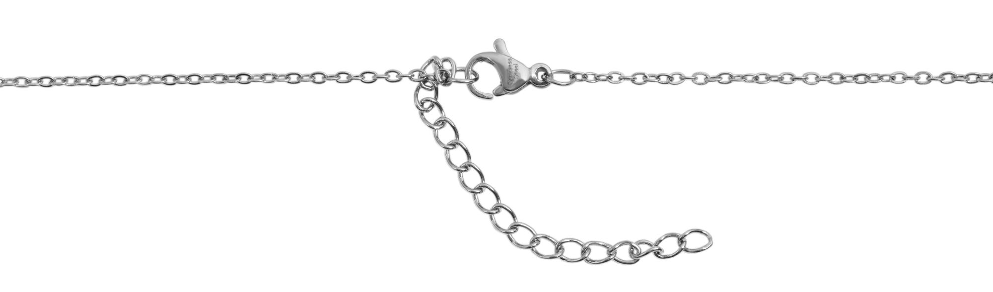 De zilverkleurige damesketting van het merk Akzent is gemaakt van roestvrij staal en heeft een ankerpatroon. De ketting is 43 cm lang, 1 mm breed en 1 mm dik. Aan de ketting is ook een verlengketting van 5 cm bevestigd, waardoor de lengte met maximaal 5 cm kan worden gevarieerd en dit bijzondere sieraad aan elke outfit kan worden aangepast. De ketting heeft ook een roestvrijstalen hanger die 6 mm lang, 7 mm breed en 2 mm dik is. De ketting kan worden geopend en gesloten met een karabijnsluiting, die ook van roestvrij staal is gemaakt.