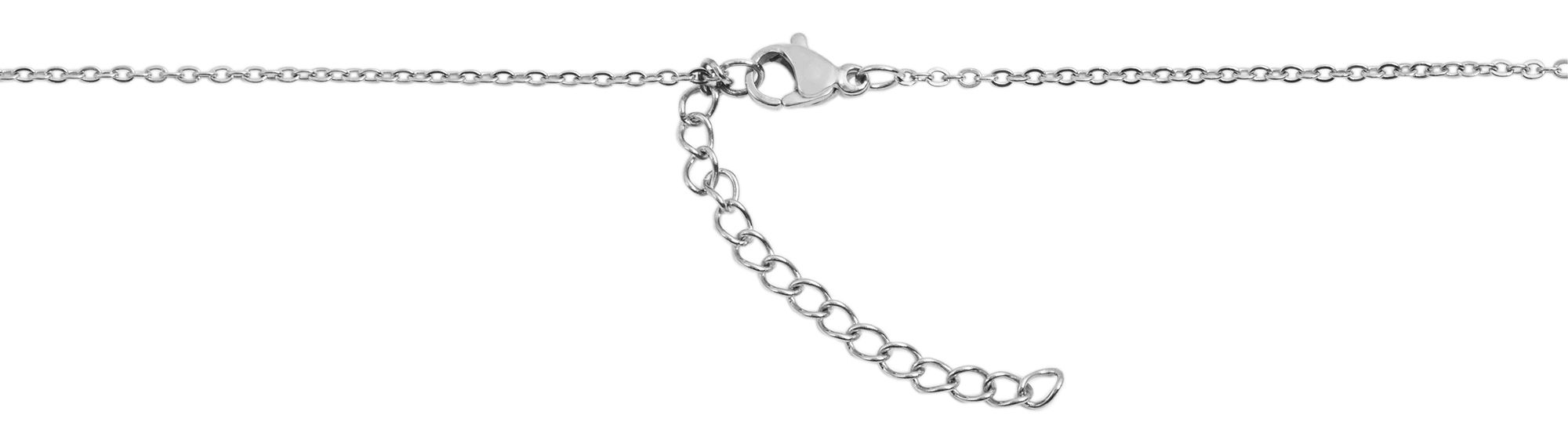 De zilverkleurige damesketting van het merk Akzent is gemaakt van roestvrij staal en heeft een ankerpatroon. De ketting is 43 cm lang, 1 mm breed en 1 mm dik. Aan de ketting is ook een verlengketting van 5 cm bevestigd, waardoor de lengte met maximaal 5 cm kan worden gevarieerd en dit bijzondere sieraad aan elke outfit kan worden aangepast. De ketting heeft ook een roestvrijstalen hanger versierd met similisteen en is 12 mm lang, 18 mm breed en 3 mm dik. De ketting kan worden geopend en gesloten met een karabijnsluiting, die ook van roestvrij staal is.