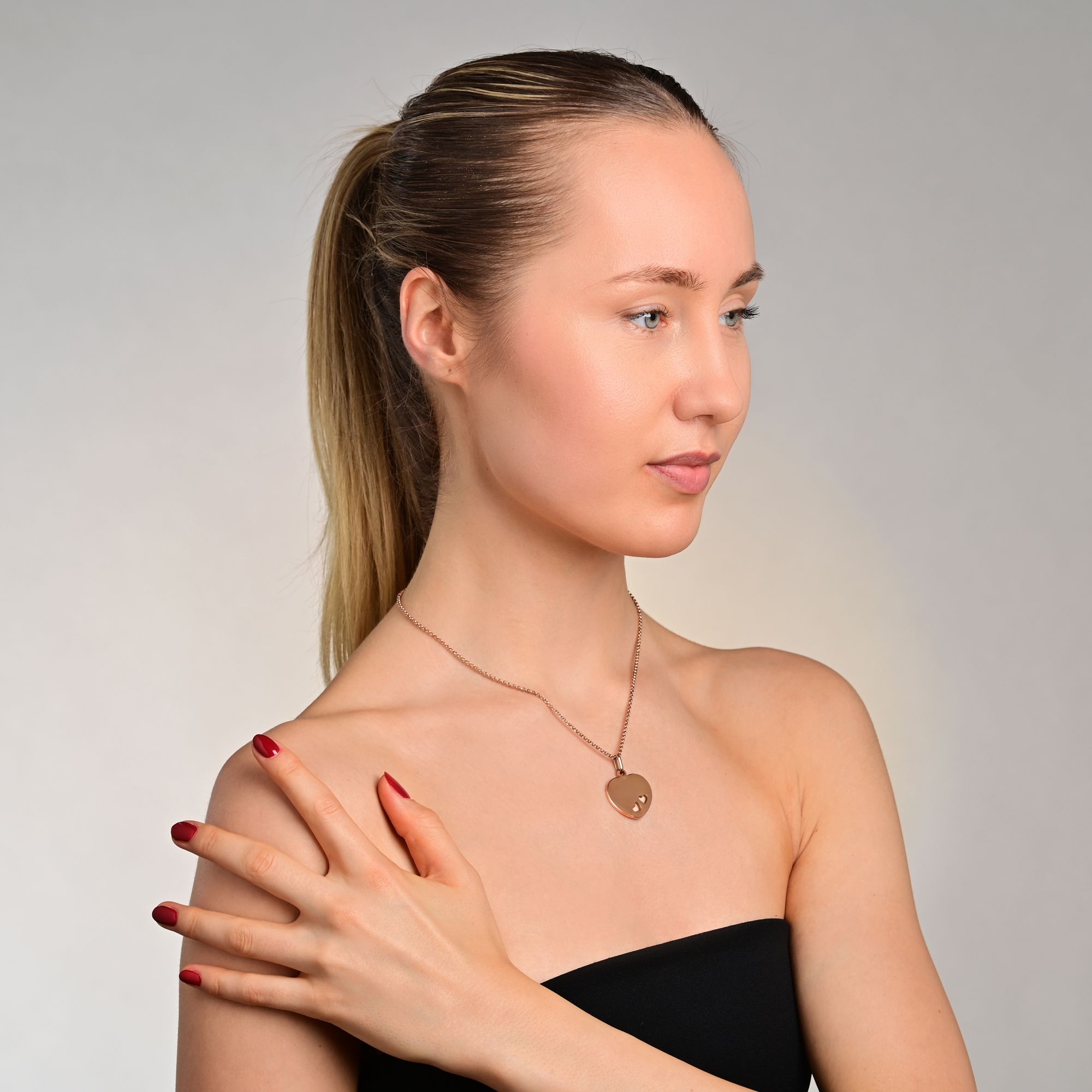 De roségoudkleurige graveerhanger van het merk Akzent is gemaakt van roestvrij staal en heeft de vorm van een hart. In de zijkant van het hart zijn twee kleine frezingen verwerkt, die ook de vorm van een hart hebben. Het resterende oppervlak van de hanger kan worden aangepast met allerlei gravures op zowel de voor- als achterkant. Het oppervlak van de graveerplaat is hoogglans gepolijst. Dankzij het ovale oogje kan de hanger aan verschillende kettingen worden bevestigd. De afmetingen komen voort uit een lengte van 26 mm, een breedte van 25 mm en een materiaaldikte van 2 mm. Dankzij het robuuste materiaal en de hoogwaardige afwerking belooft de sieradenhanger een lange levensduur. Hij is ook perfect als persoonlijk geschenk voor speciale herinneringen of mensen.
