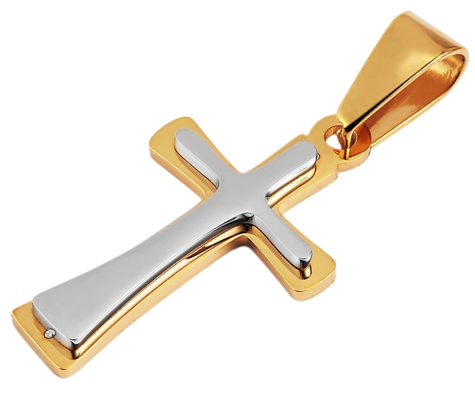 De hanger van het merk Akzent in de vorm van een kruis is gemaakt van roestvrij staal en is ook geïoniseerd. Deze coating verbetert de uitstraling van het materiaal. De hanger is goudkleurig. Aan het goudkleurige kruis is nog een kleiner kruis in zilverkleur bevestigd. Deze zogenaamde "twin look" maakt de hanger tot een visueel hoogtepunt. De hanger is 28 mm lang, 16 mm breed en 3 mm dik.