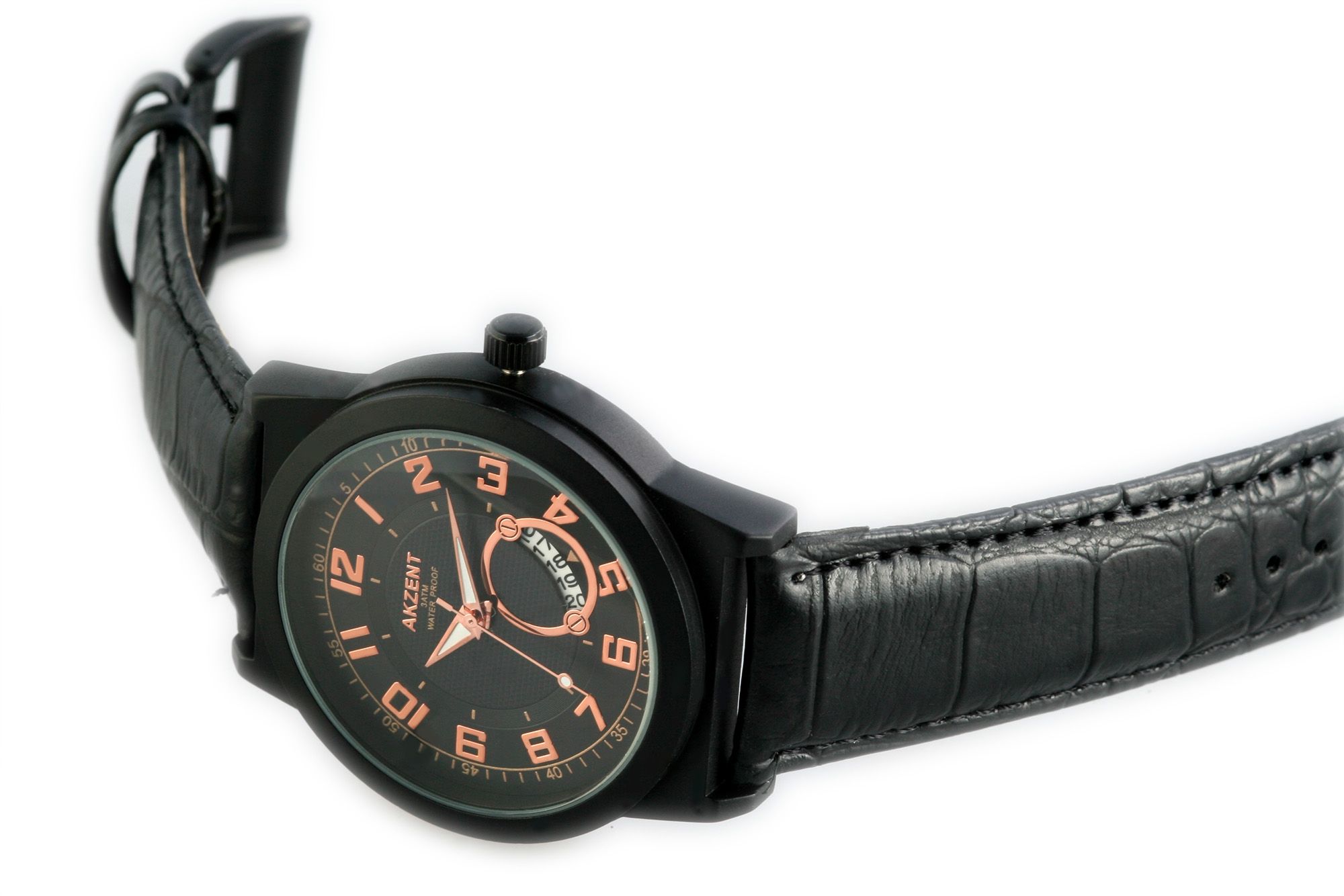 Het Akzent analoge herenhorloge heeft een hoogwaardig kwartsuurwerk. De imitatieleren band is 24 mm breed en opent met een gesp. De totale lengte is 23 cm. De metalen kast met mineraalglas meet 45 mm en is 13 mm hoog. De kastdeksel is gemaakt van roestvrij staal. Het horloge is getest op een druk van 3 ATM. Het Akzent herenhorloge heeft de volgende kenmerken: Datumweergave.