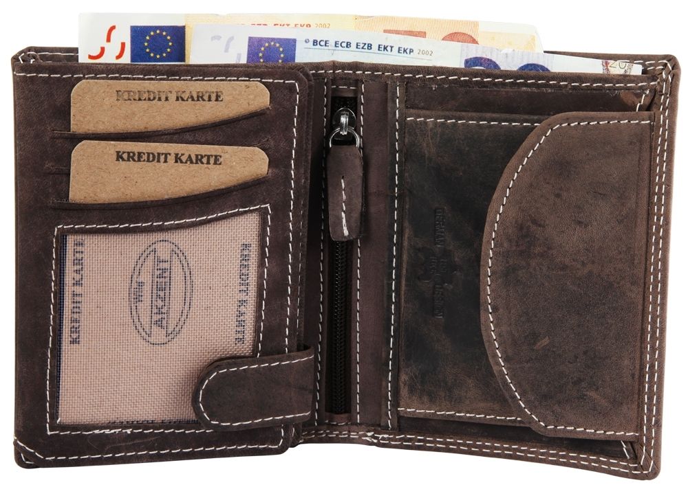Accent herenportemonnee gemaakt van . De portemonnee is 9 cm breed en 12 cm hoog. De kleur is donkerbruin. De echt leren portemonnee wordt gesloten met een drukknoopsluiting. Hij heeft 2 biljetvakken, een kleingeldvakje, 10 creditcardvakjes, een transparant creditcardvak en 2 transparante ID-kaartvakken.