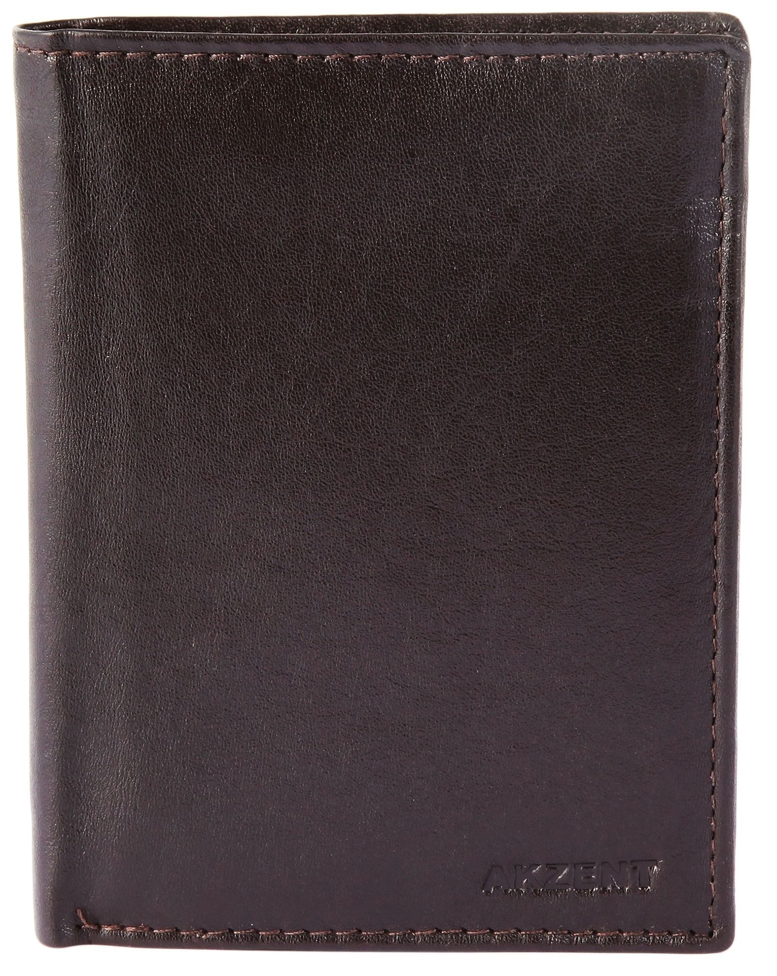 Accent herenportemonnee van echt leer. De portemonnee is 9 cm breed en 12 cm hoog. De kleur is donkerbruin. Hij heeft 2 biljetvakken, een klein kleingeldvak, 10 creditcardvakjes, een transparant creditcardvak en een transparant ID-kaartvak.