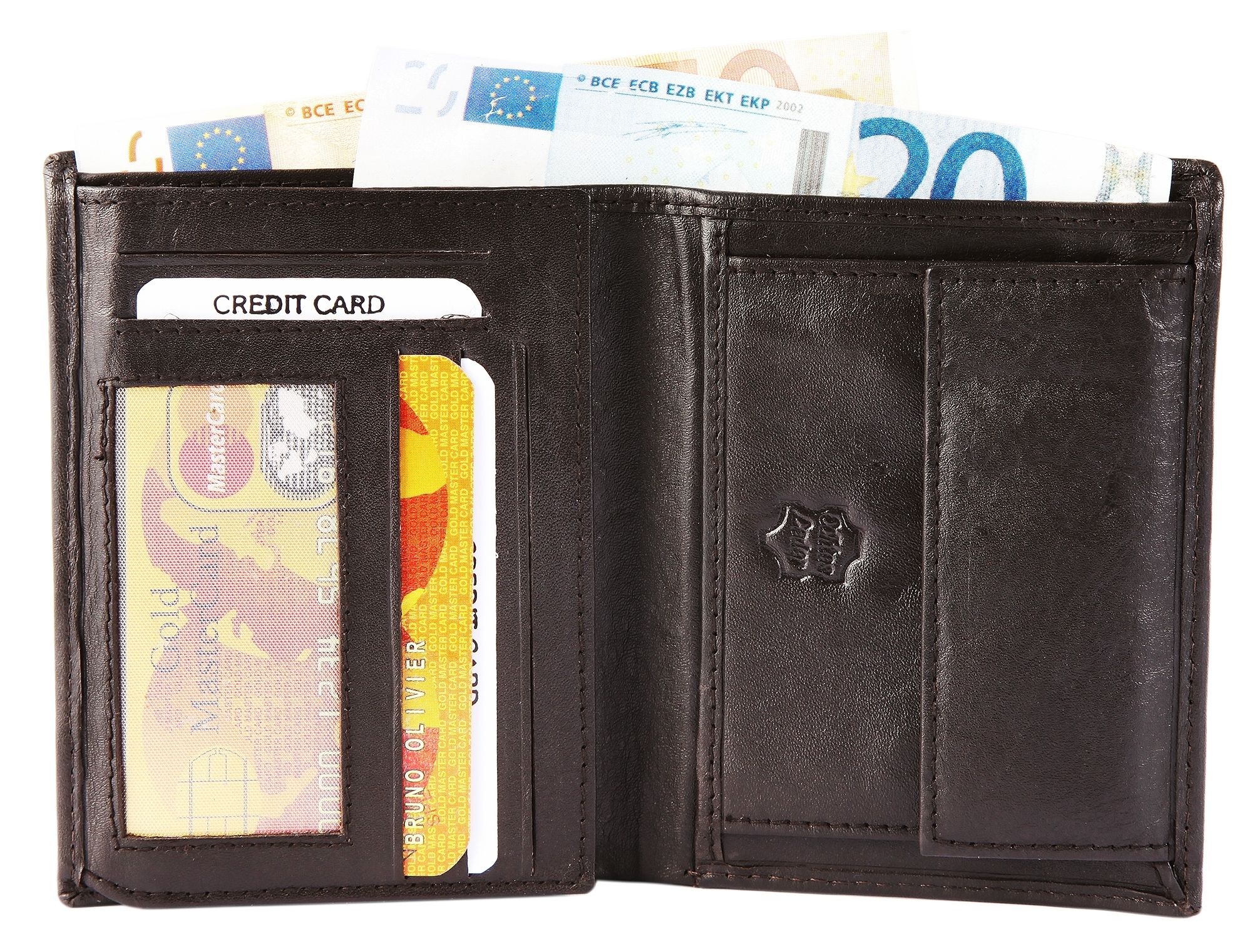 Productinformatie "Accent herenportemonnee van echt leer in donkerbruin. Formaat 9 x 12 cm."