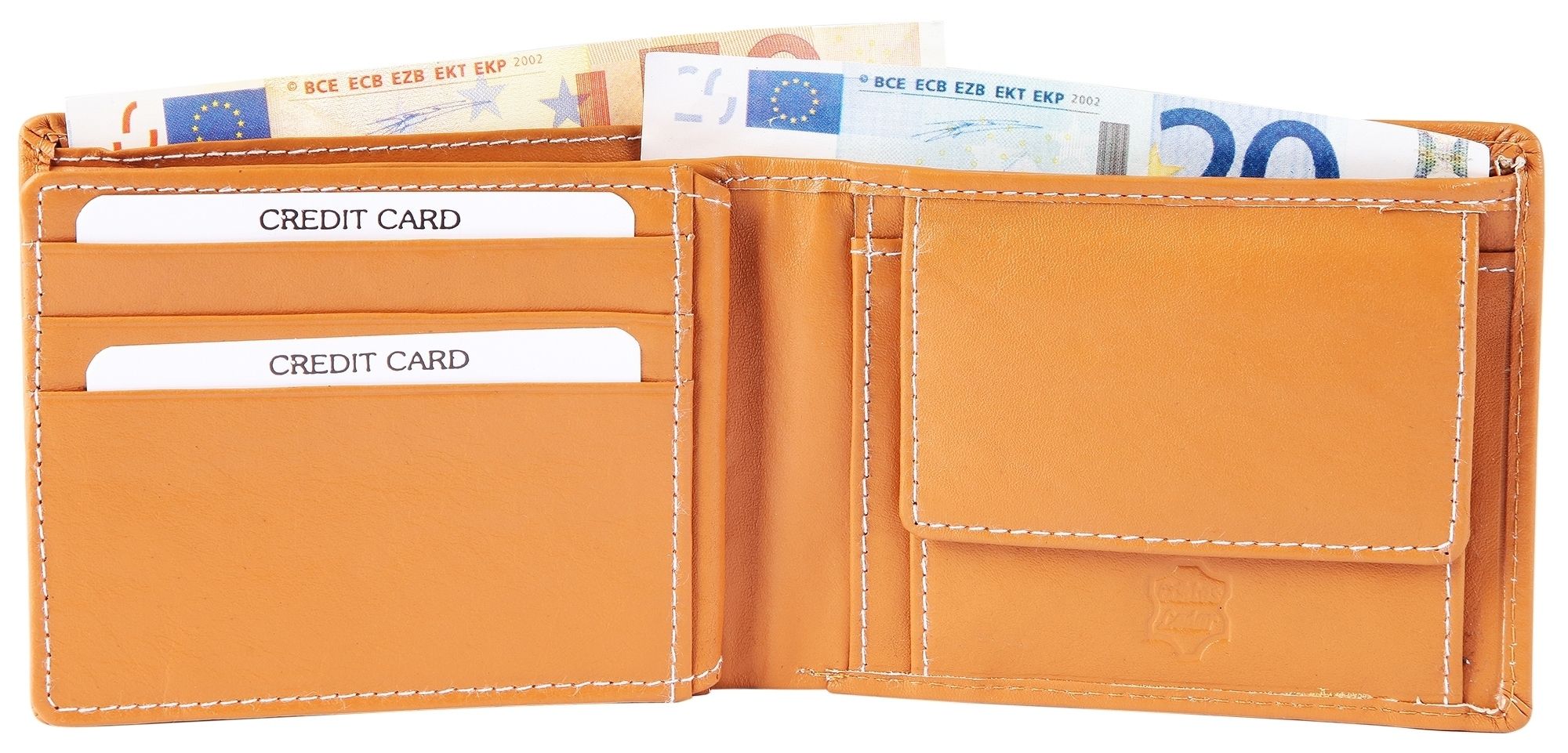 Accent herenportemonnee van echt leer. De liggende portemonnee is 12 cm breed en 9 cm hoog. De kleur is lichtbruin. Hij heeft 2 biljetvakken, een klein kleingeldvak, 5 creditcardvakken, een transparant creditcardvak en een transparant ID-kaartvak.