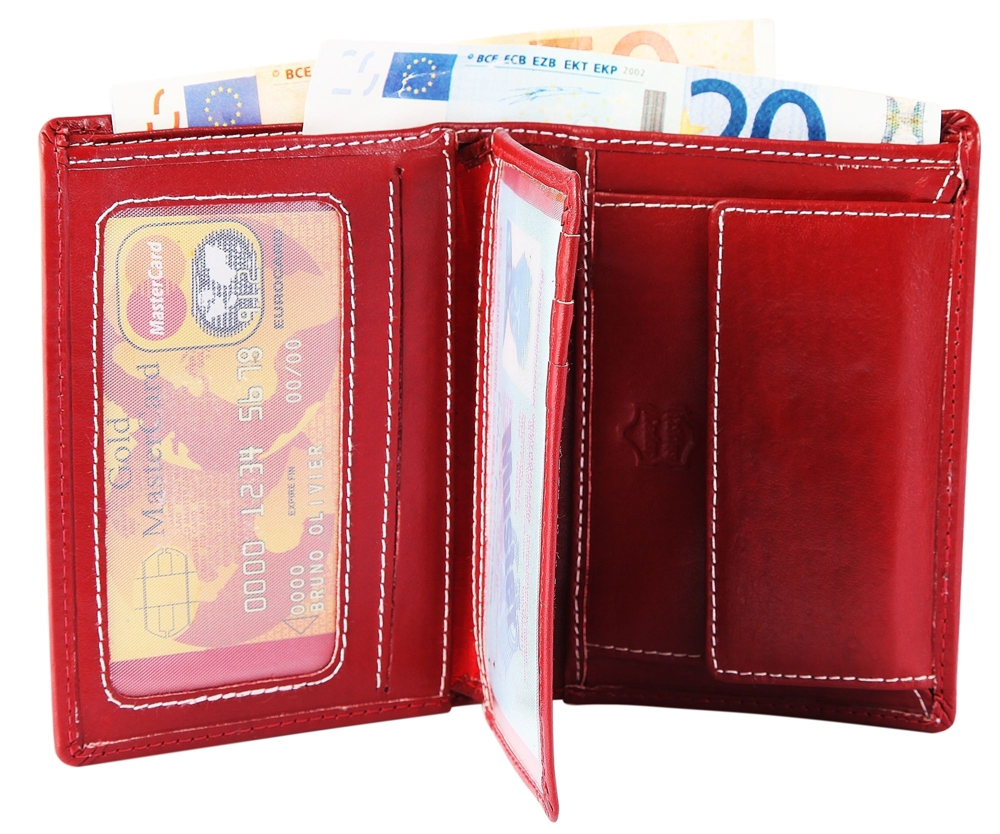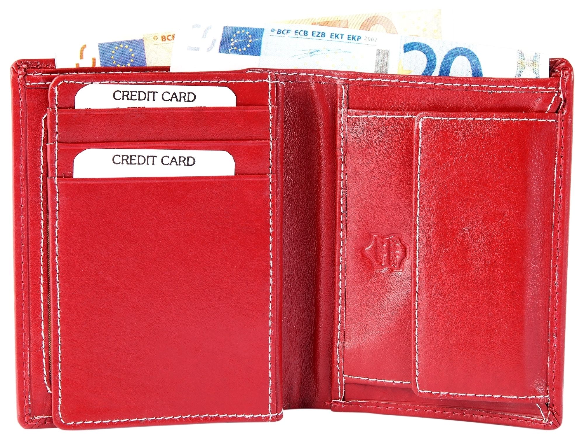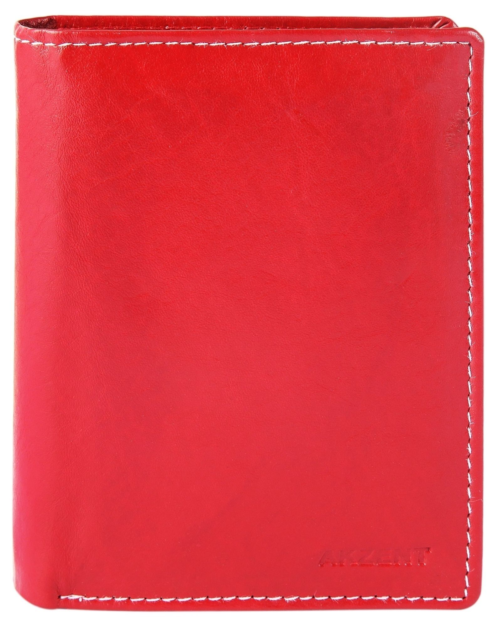 Accent herenportemonnee van echt leer. De portemonnee is 10 cm breed en 12 cm hoog. De kleur is rood. Hij heeft 2 biljetvakken, een klein kleingeldvak, 6 creditcardvakken, een transparant creditcardvak en een transparant ID-kaartvak.