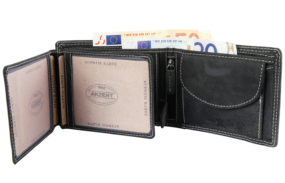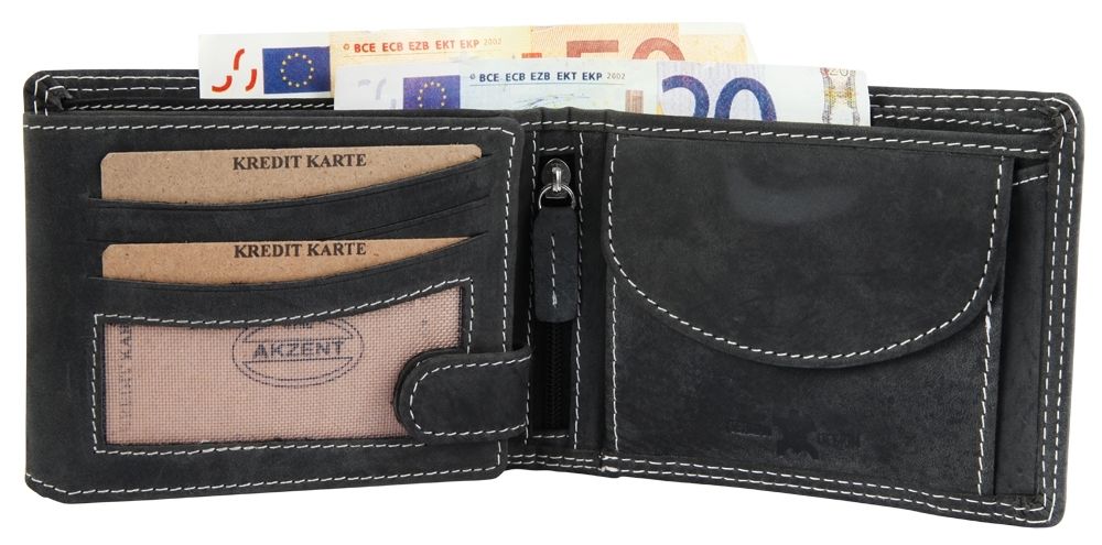 Accent herenportemonnee van echt leer. De liggende portemonnee is 12 cm breed en 9 cm hoog. De kleur is antraciet. Hij heeft 2 biljetvakken, een klein kleingeldvak, 8 creditcardvakken, een transparant creditcardvak en 2 transparante ID-kaartvakken.
