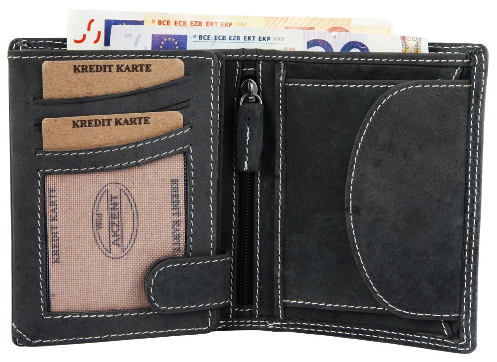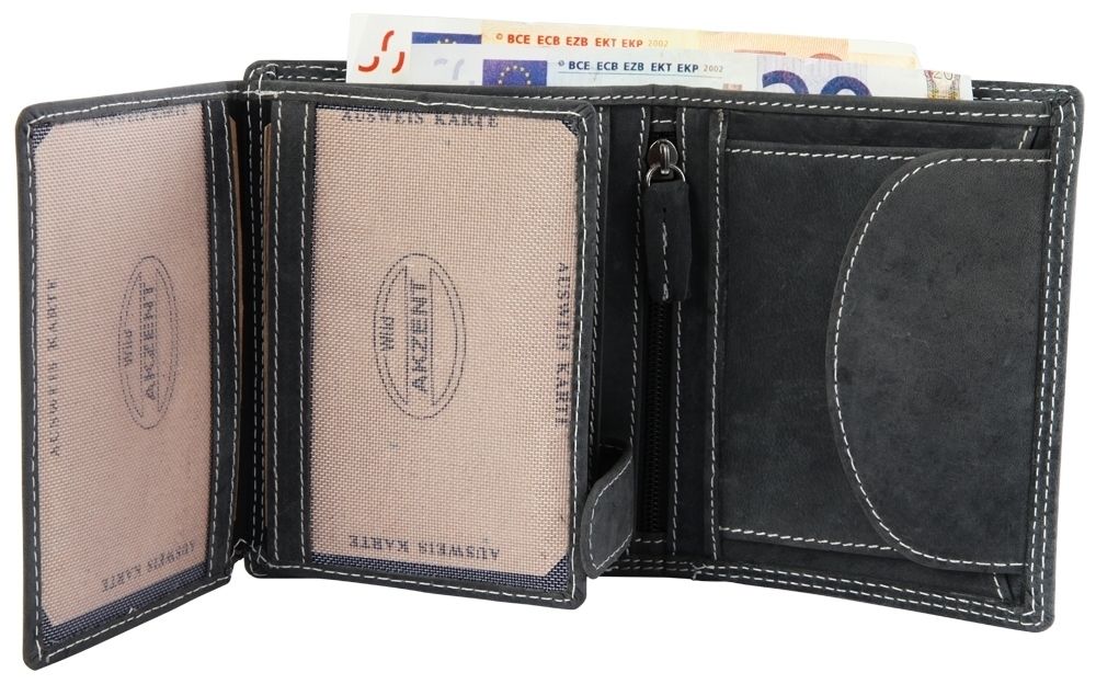 Accent herenportemonnee van echt leer. De portemonnee is 9 cm breed en 12 cm hoog. De kleur is antraciet. De echt leren portemonnee wordt gesloten met een drukknoopsluiting. Hij heeft 2 biljetvakken, een klein kleingeldvak, 10 creditcardvakjes, een transparant creditcardvak en 2 transparante ID-kaartvakken.