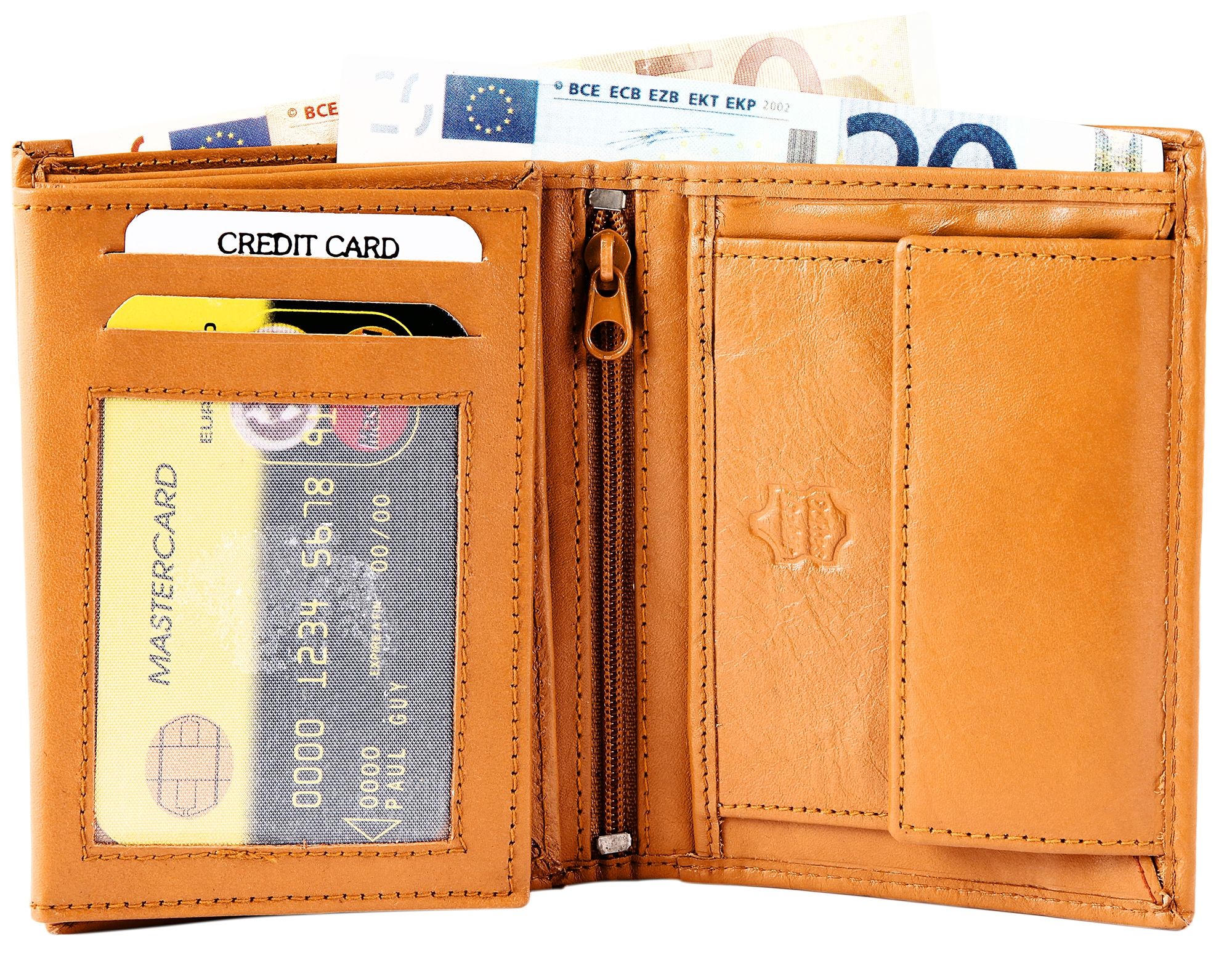 Accent herenportemonnee van echt leer. De portemonnee is 9 cm breed en 12 cm hoog. De kleur is lichtbruin. Hij heeft 2 biljetvakken, een klein kleingeldvak, 11 creditcardvakken, een transparant creditcardvak en 2 transparante ID-kaartvakken.