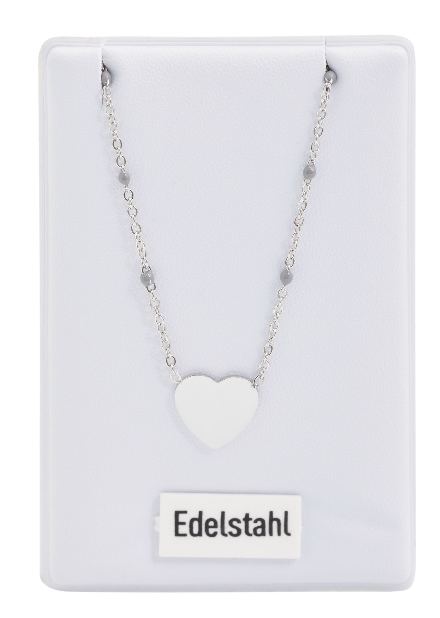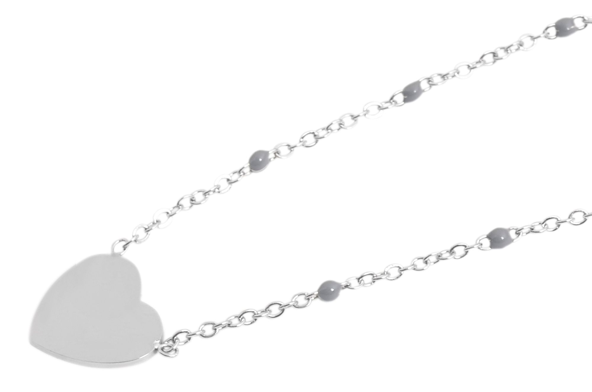 De zilverkleurige ketting van het merk Akzent is gemaakt van roestvrij staal in een ankerpatroon. Aan de ketting is een zilverkleurige hanger in de vorm van een hart bevestigd. Bovendien zijn grijze geëmailleerde bollen gelijkmatig verdeeld en zetten ze het geheel vakkundig in scène. De hartvormige hanger is gepolijst en heeft daardoor een stralende glans. Het kan ook worden aangepast met filigraan gravures, waardoor het een zeer persoonlijk accessoire is dat ideaal is als cadeau. De sieradenketting kan worden geopend en gesloten met een karabijnsluiting, die ook zilverkleurig is en gemaakt van roestvrij staal. Aan één uiteinde van de ketting is ook een verlengkettinkje van 5 cm bevestigd, waarmee de lengte met 5 cm kan worden aangepast aan elke outfit. De afmetingen komen overeen met een lengte van 43 cm en een dikte van 1 mm. De hanger heeft een lengte van 10 mm, een breedte van 10 mm en een materiaaldikte van 1 mm. Verras je geliefde met een gepersonaliseerd sieraad en geef deze ketting cadeau voor een speciale gelegenheid, zoals Valentijnsdag, Moederdag of een verjaardag.
