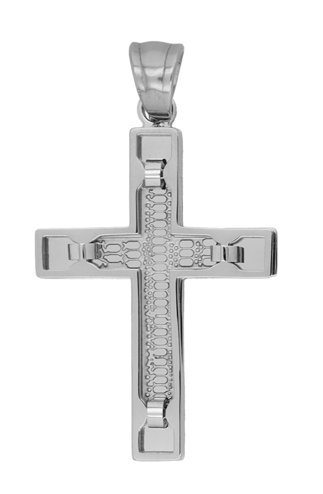 Het kruis meet 33 x 21 x 4 mm en is verkrijgbaar in verschillende designs die het tijdloze maar modieuze ontwerp benadrukken. De voorkant is gepolijst en voorzien van een opvallend kruis, terwijl de achterkant mat is, wat een interessant contrast creëert en de veelzijdigheid van deze hanger benadrukt.