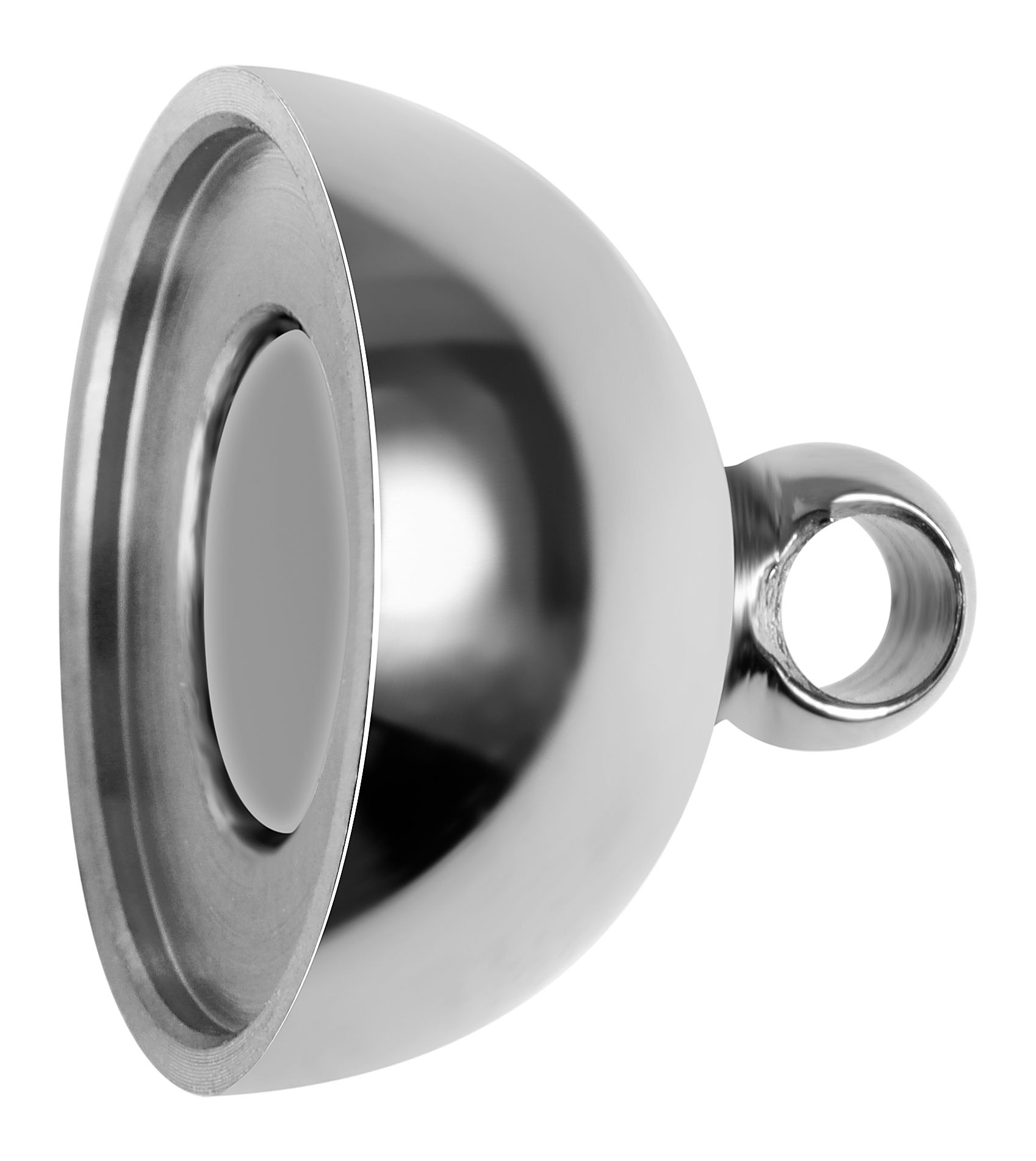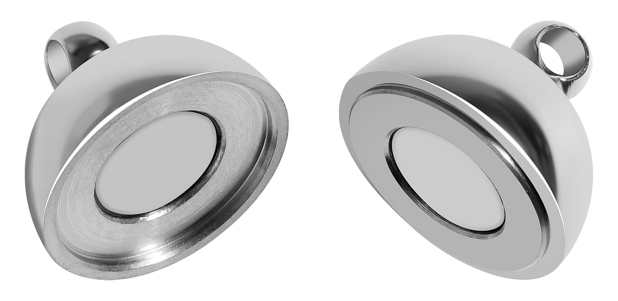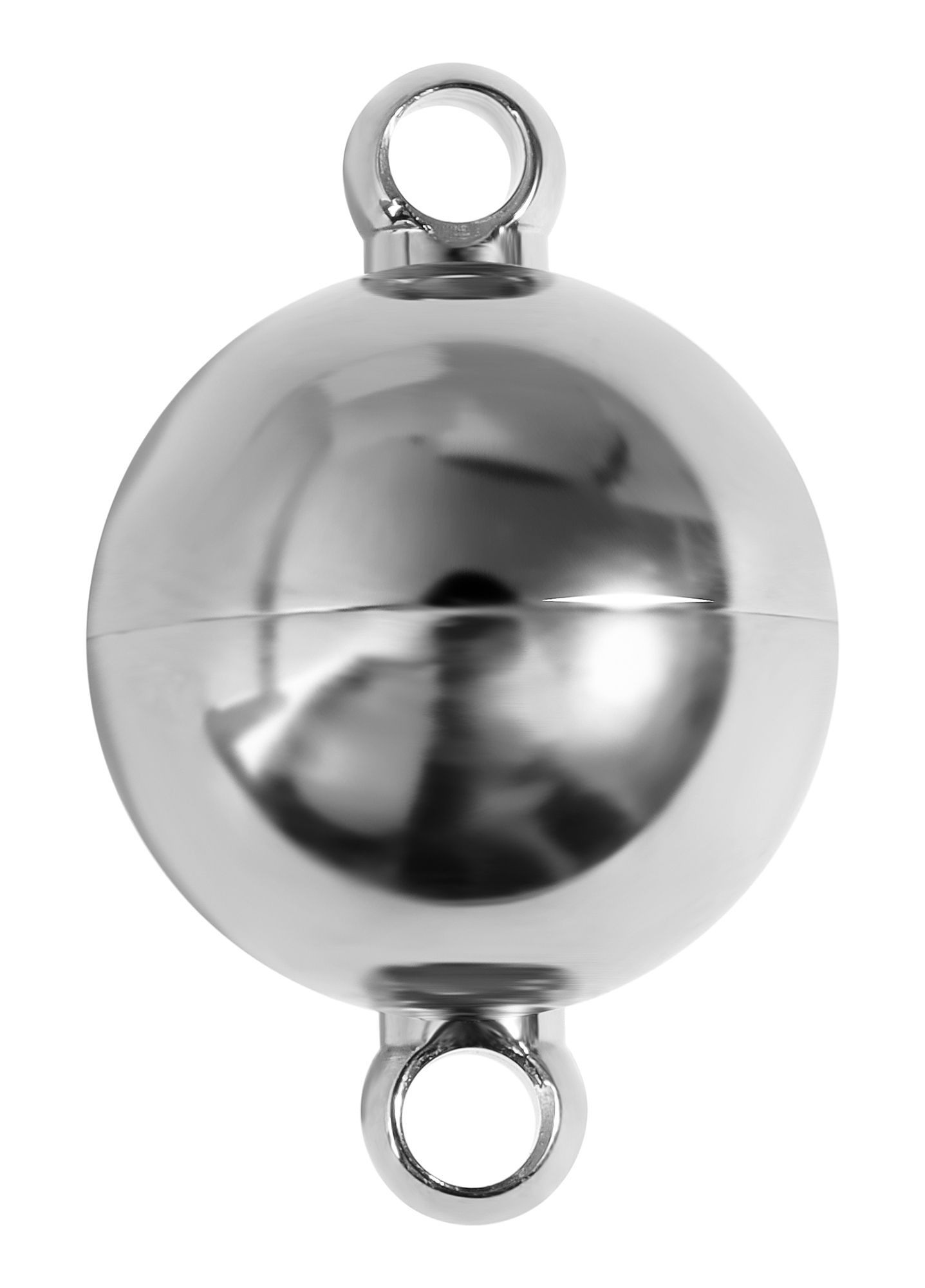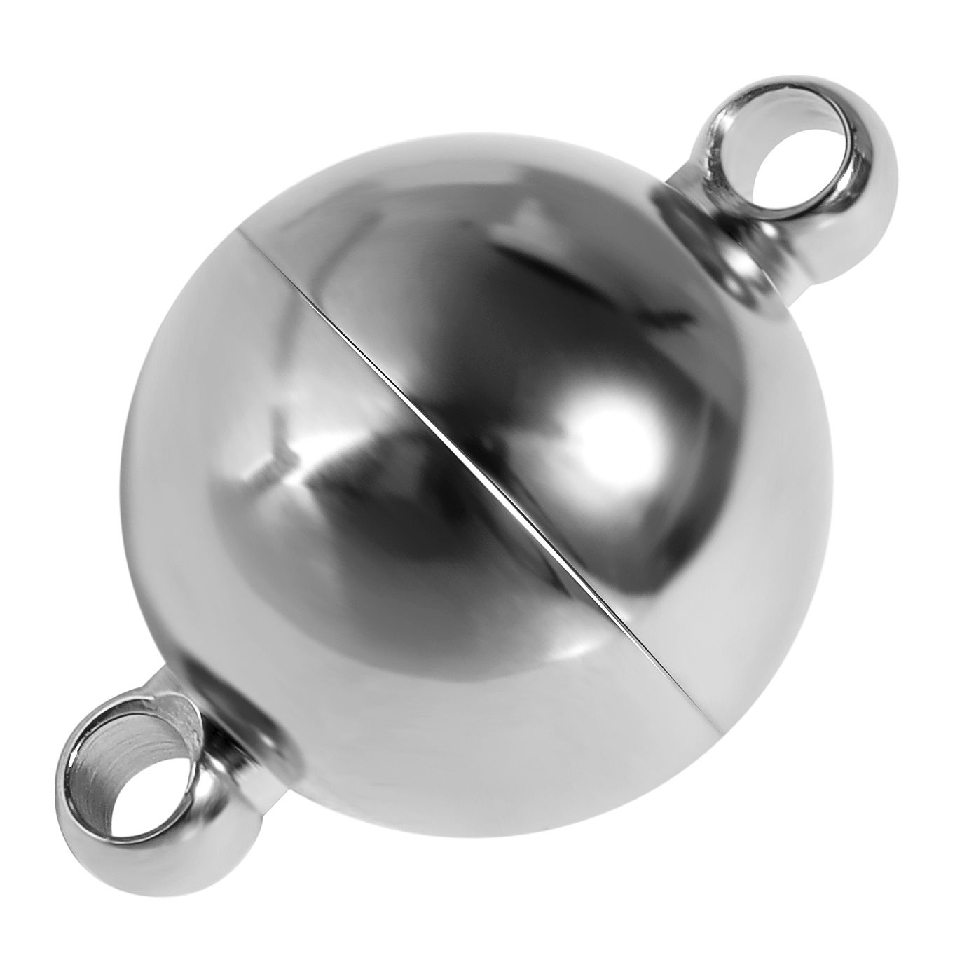 De magneetsluiting van het merk Akzent is gemaakt van roestvrij staal en is verkrijgbaar in verschillende maten. Het oppervlak is zilverkleurig en hoogglans gepolijst. De kogelvormige sluiting heeft links en rechts een open oogje waaraan elke ketting kan worden bevestigd. Dit type sluiting is erg praktisch en gemakkelijk te gebruiken, omdat de magnetische uiteinden gewoon in elkaar blijven zitten. De diameter is 12 mm.