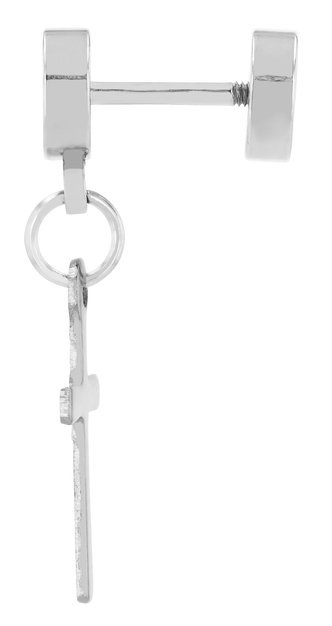 Het hoogtepunt is de kruis hanger, die elegant zwaait bij elke beweging. Met een totale lengte van 26 mm hangt het kruis elegant aan de ronde plaat en trekt het de aandacht. De praktische opening van de nepstekker wordt bereikt door hem eenvoudig te draaien, waardoor hij gemakkelijk te bevestigen en te verwijderen is.